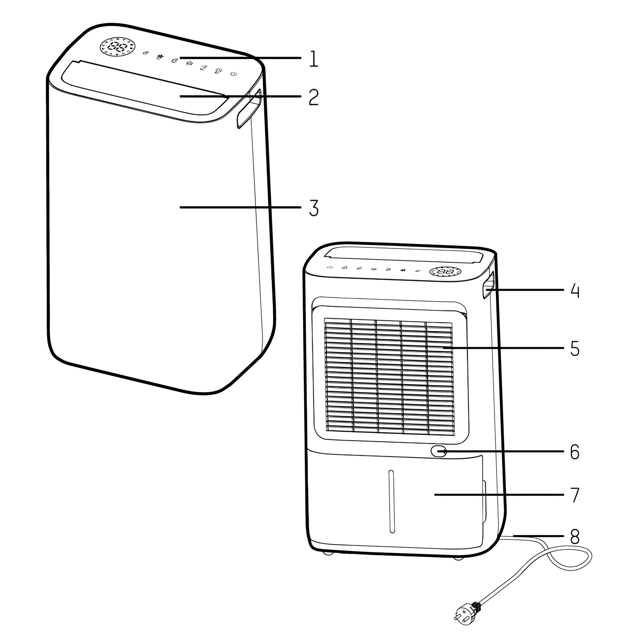 If the dehumidifier is switched off by a power cut, it will automatically switch back on once power is restored.