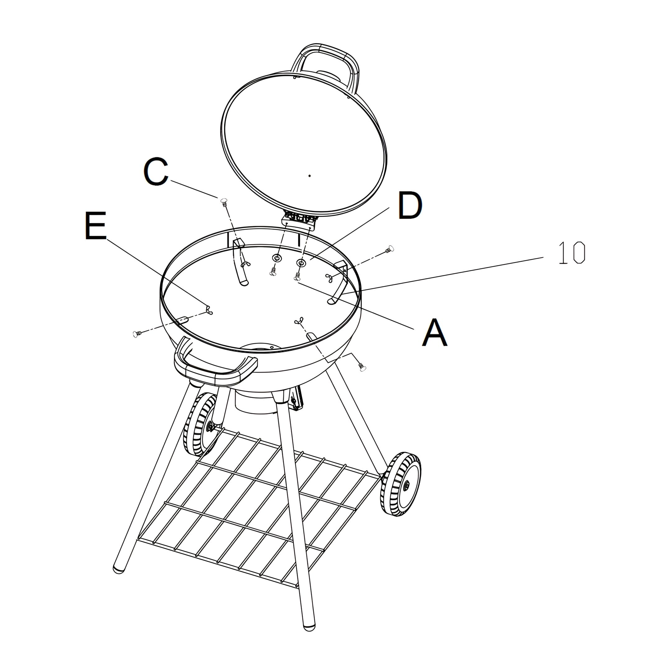 Attach the Grid Supports (10) to the interior of the BBQ Body (11) using Screws (A) and Wing Nuts (E).