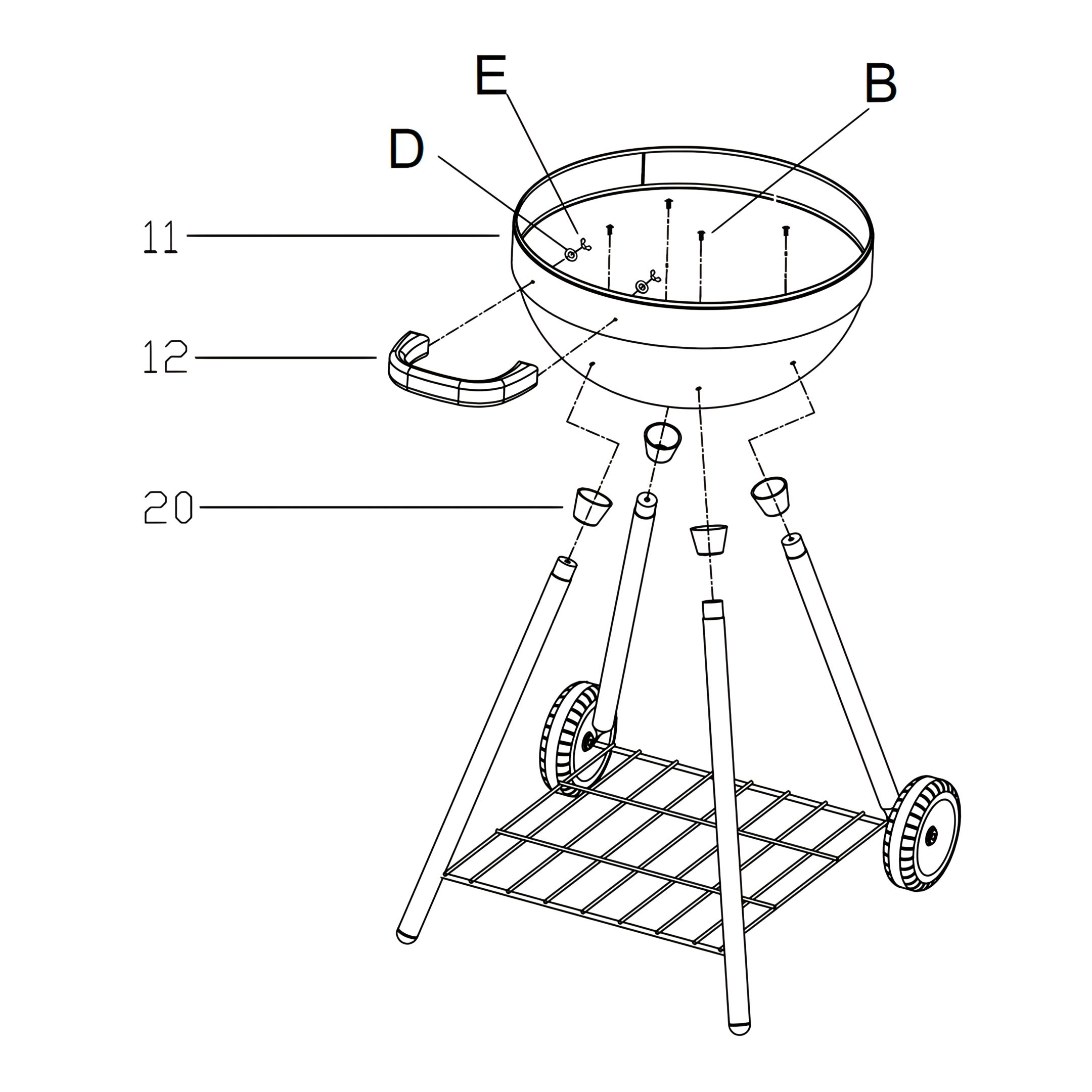 Attach the Front Handle (12) to the front of the BBQ Body (11) using Washers (D), and Wing Nuts (E).