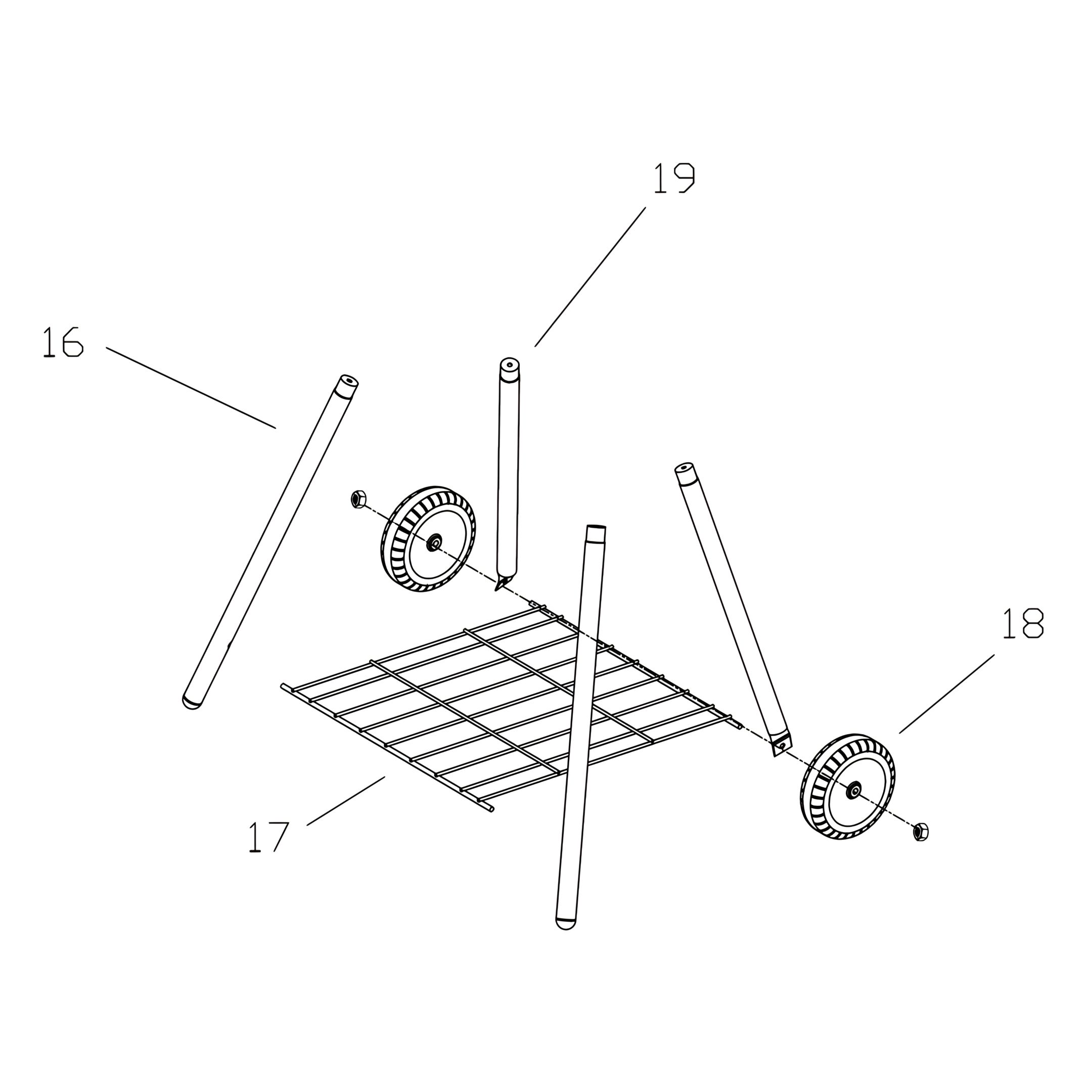 Insert the ends of the Bottom Shelf Grid (17) into the holes of the Wheel Legs (16)