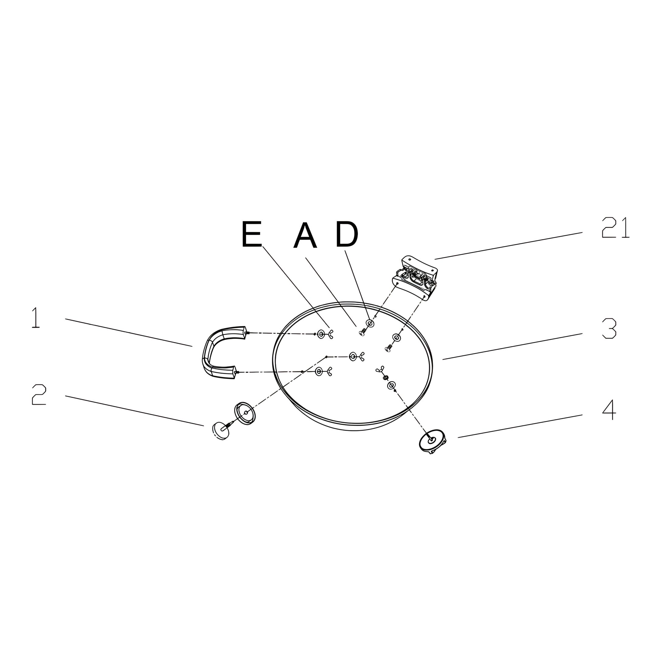 Attach the Lid Handle (1) to the top of the Lid using Washers (D), and Wing Nuts (E).