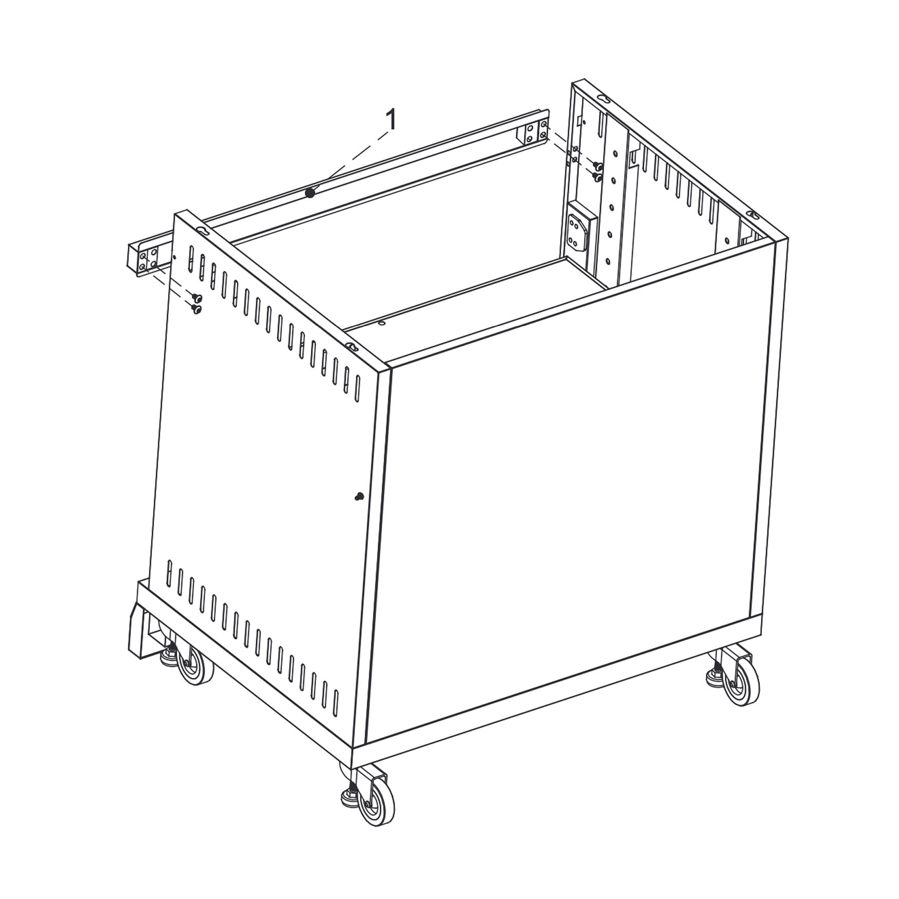 Position the door bracket (1) on the top front of the cabinet as shown.