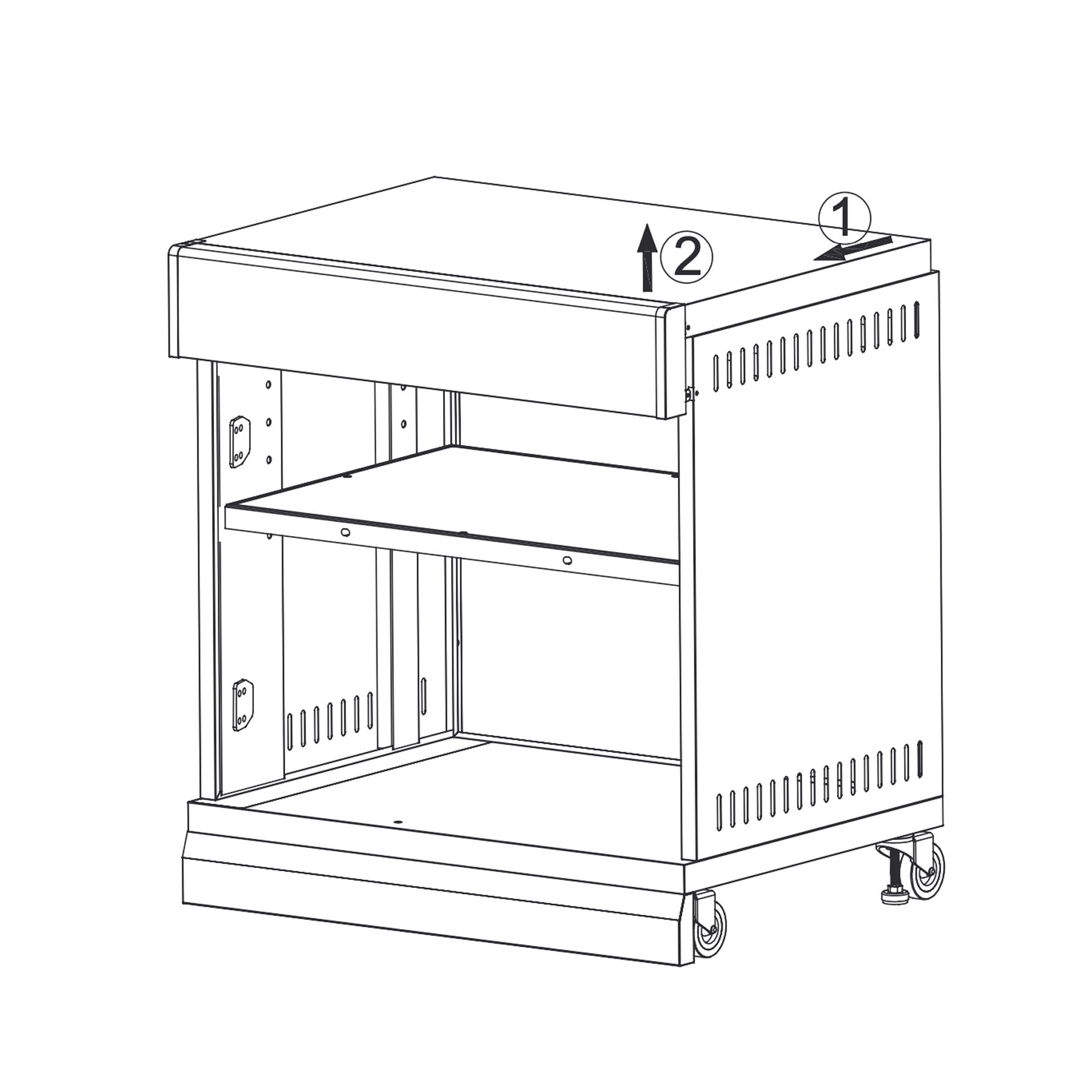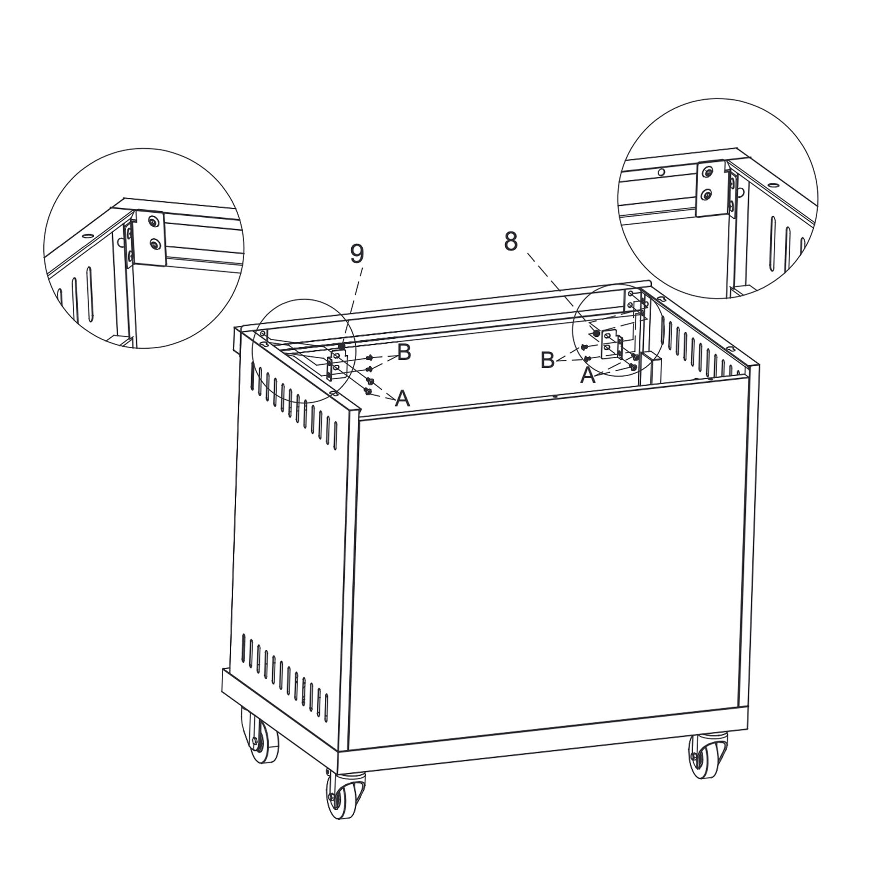 Install the left bracket (8) and right bracket (9) inside the cabinet, at the top front corners.