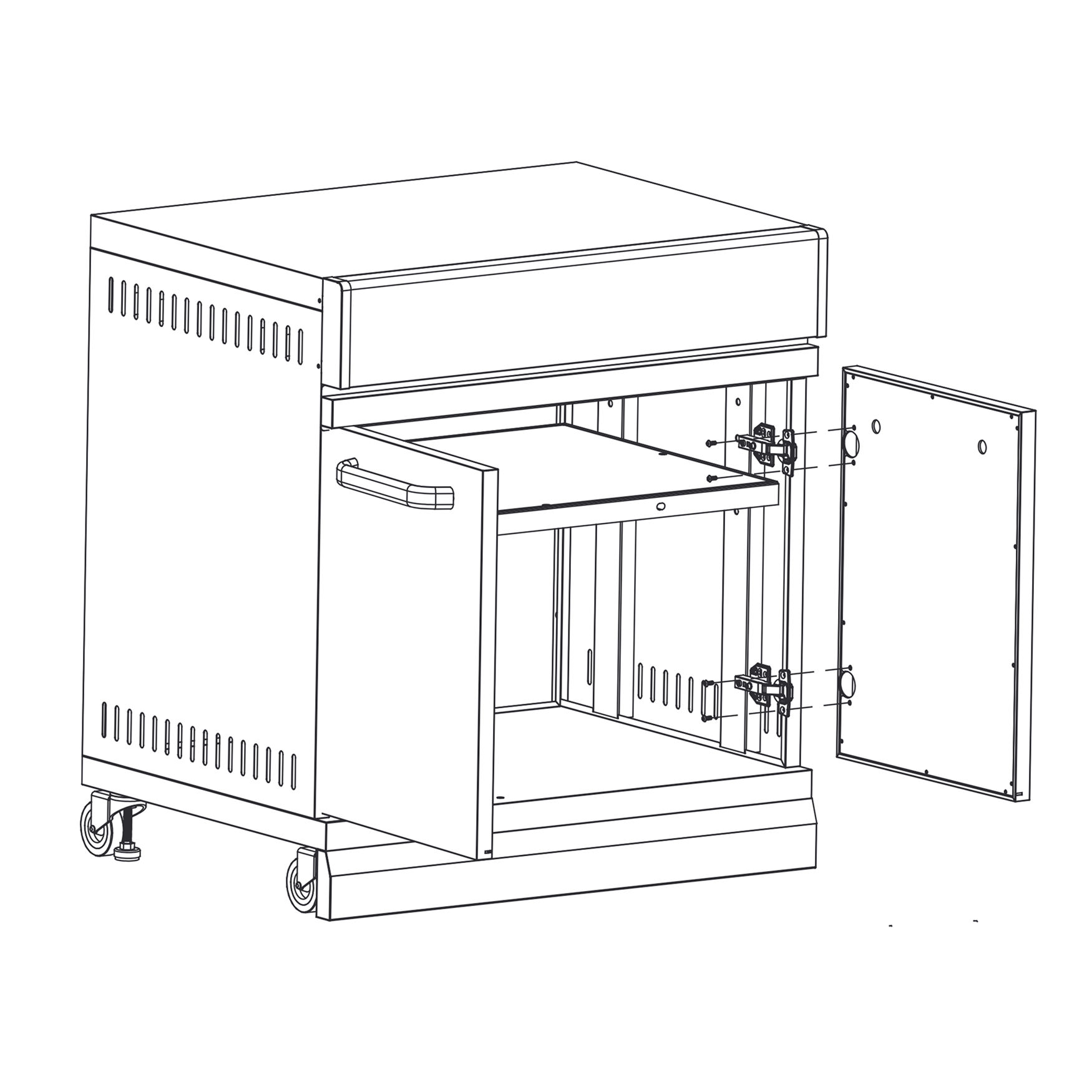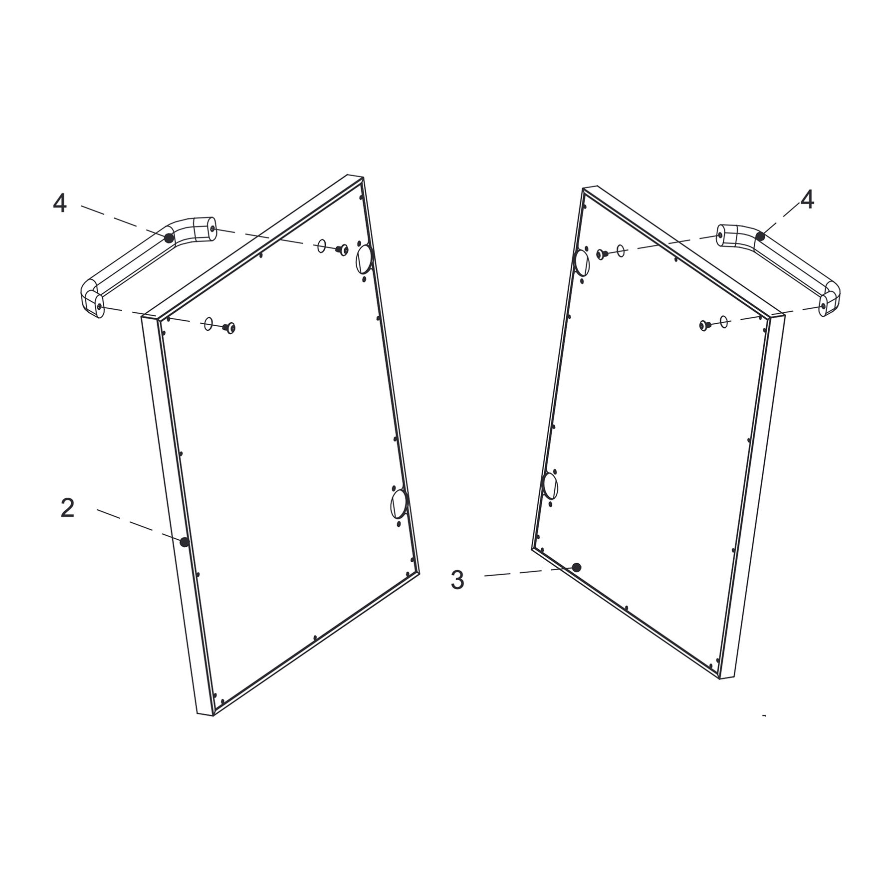 Attach the door handles (4) to the left door (2) and right door (3).