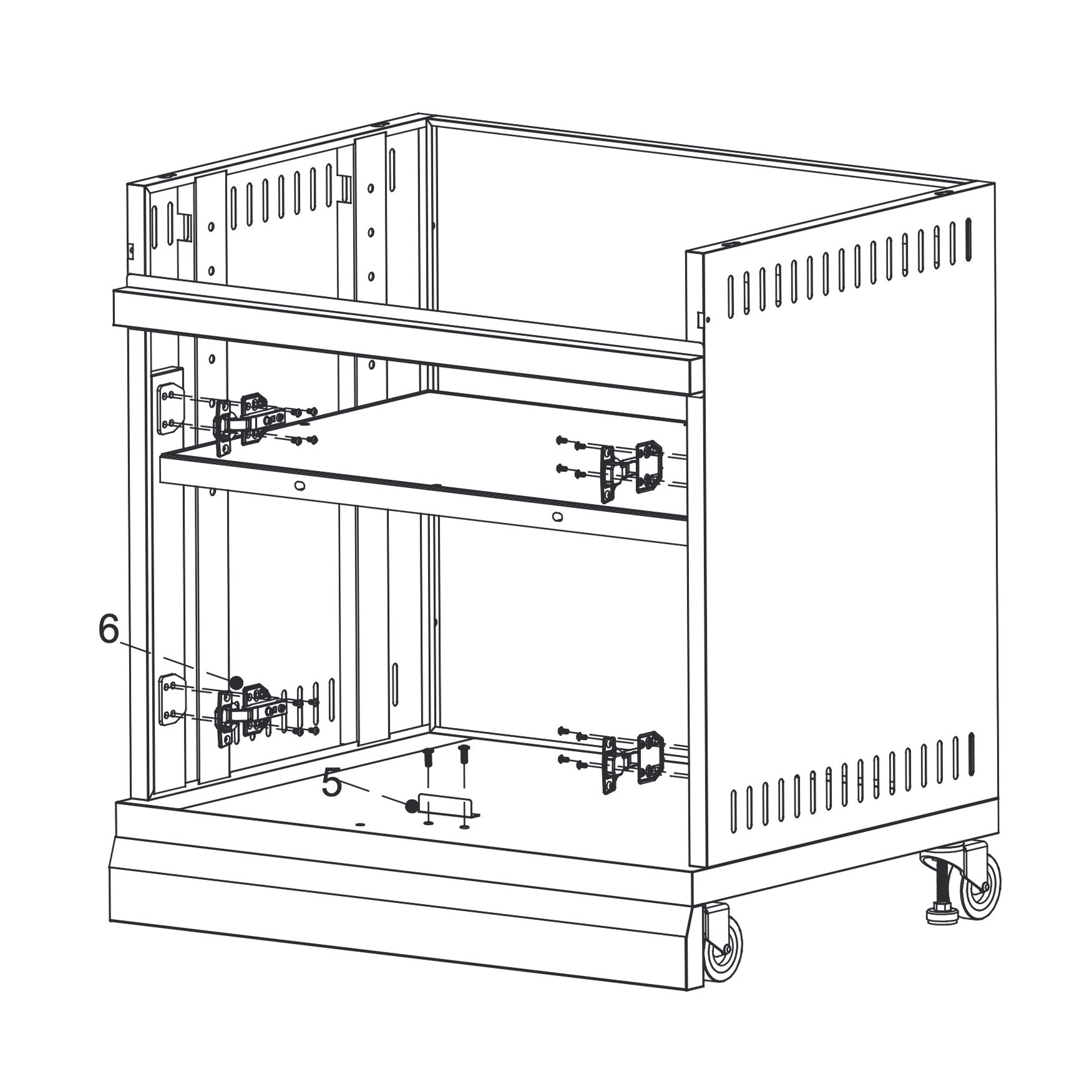 Fix each bracket to the cabinet frame as shown in the detail views.