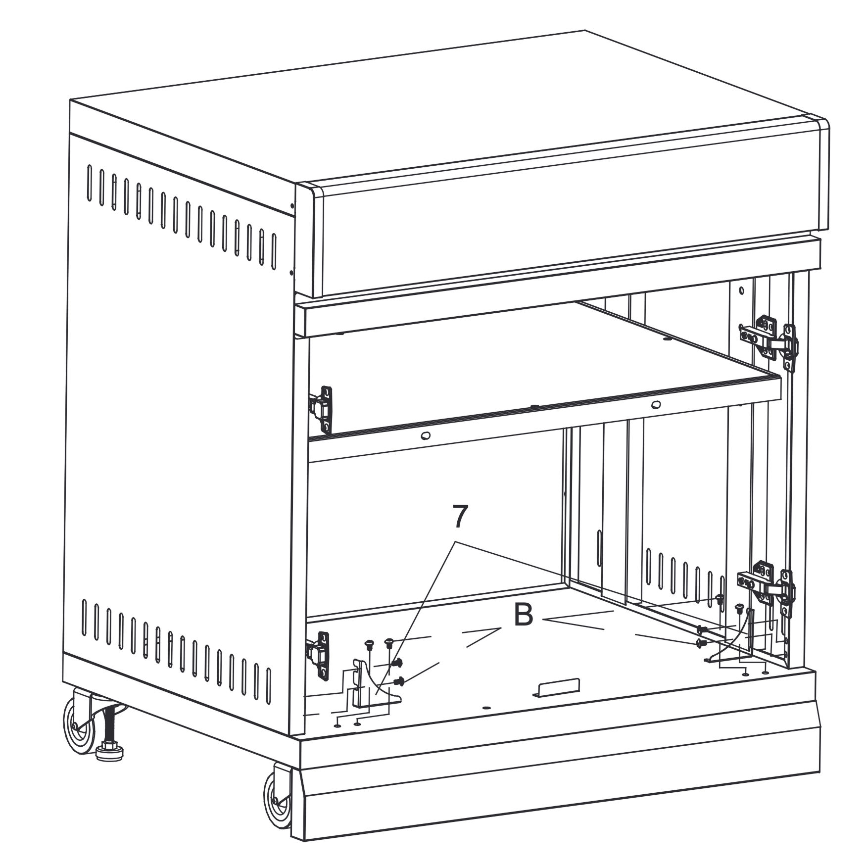 Install the connect brackets (7) at the bottom front inside the cabinet, as shown.