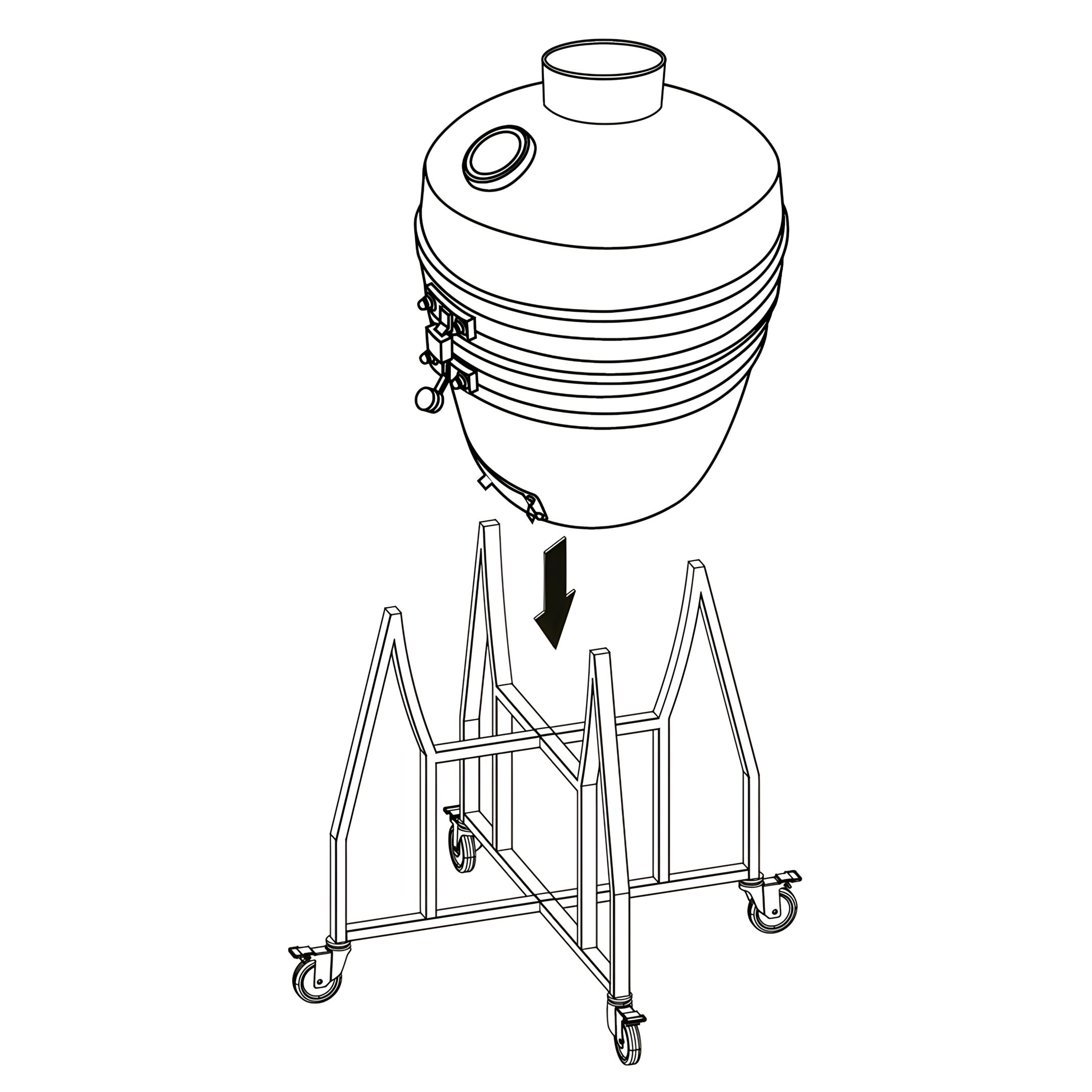 With two or more people, carefully lift the Ceramic Kamado Bottom (3.10) and lower it into the assembled Trolley Frame as shown.