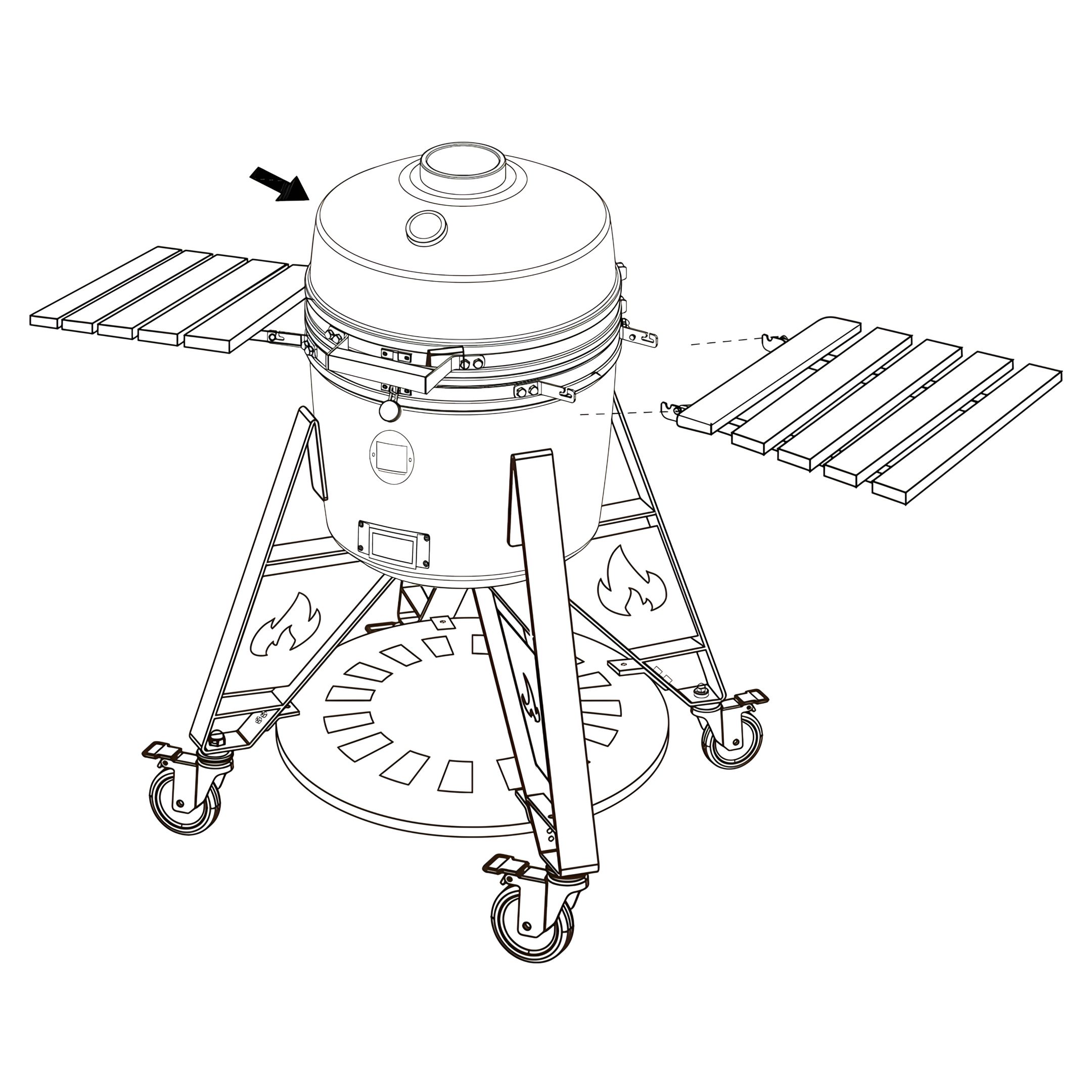 Position each Side Shelf Support (5) on the sides of the Ceramic Kamado (3.11) as shown.