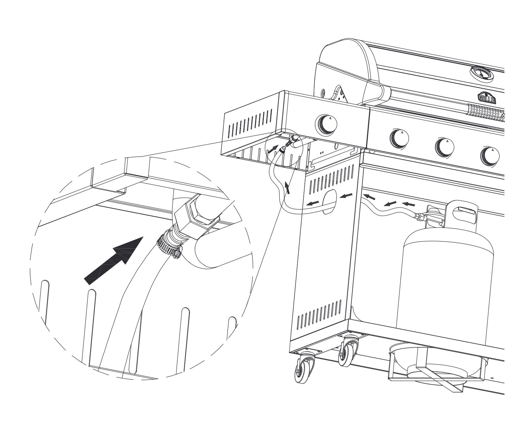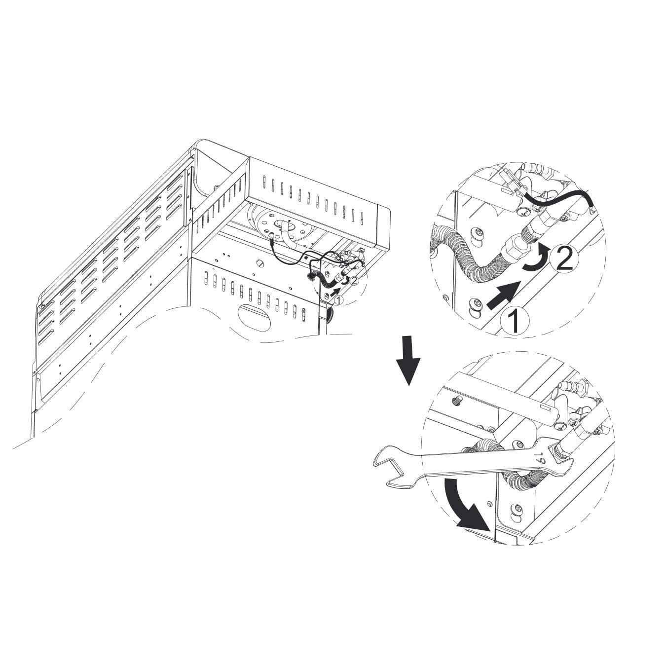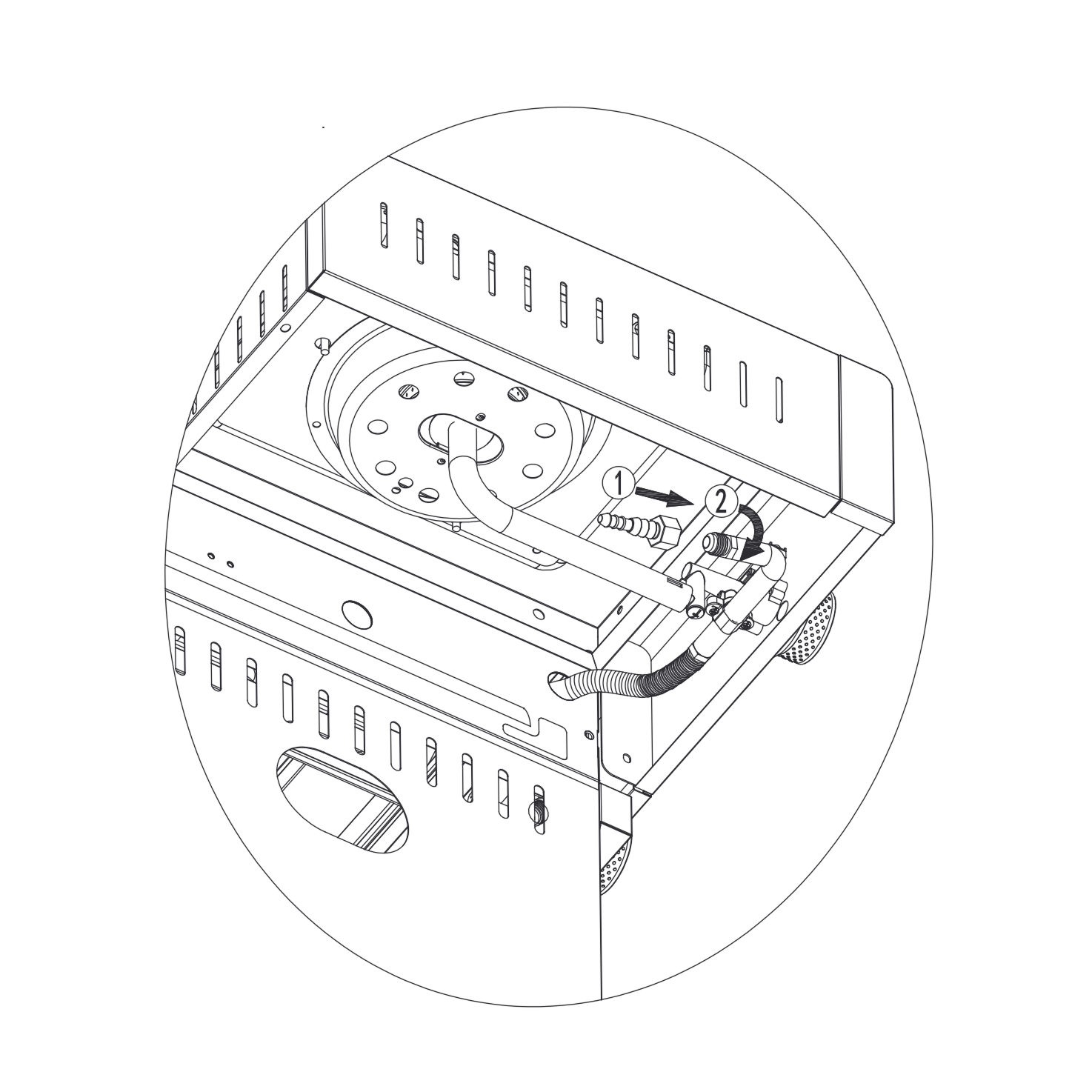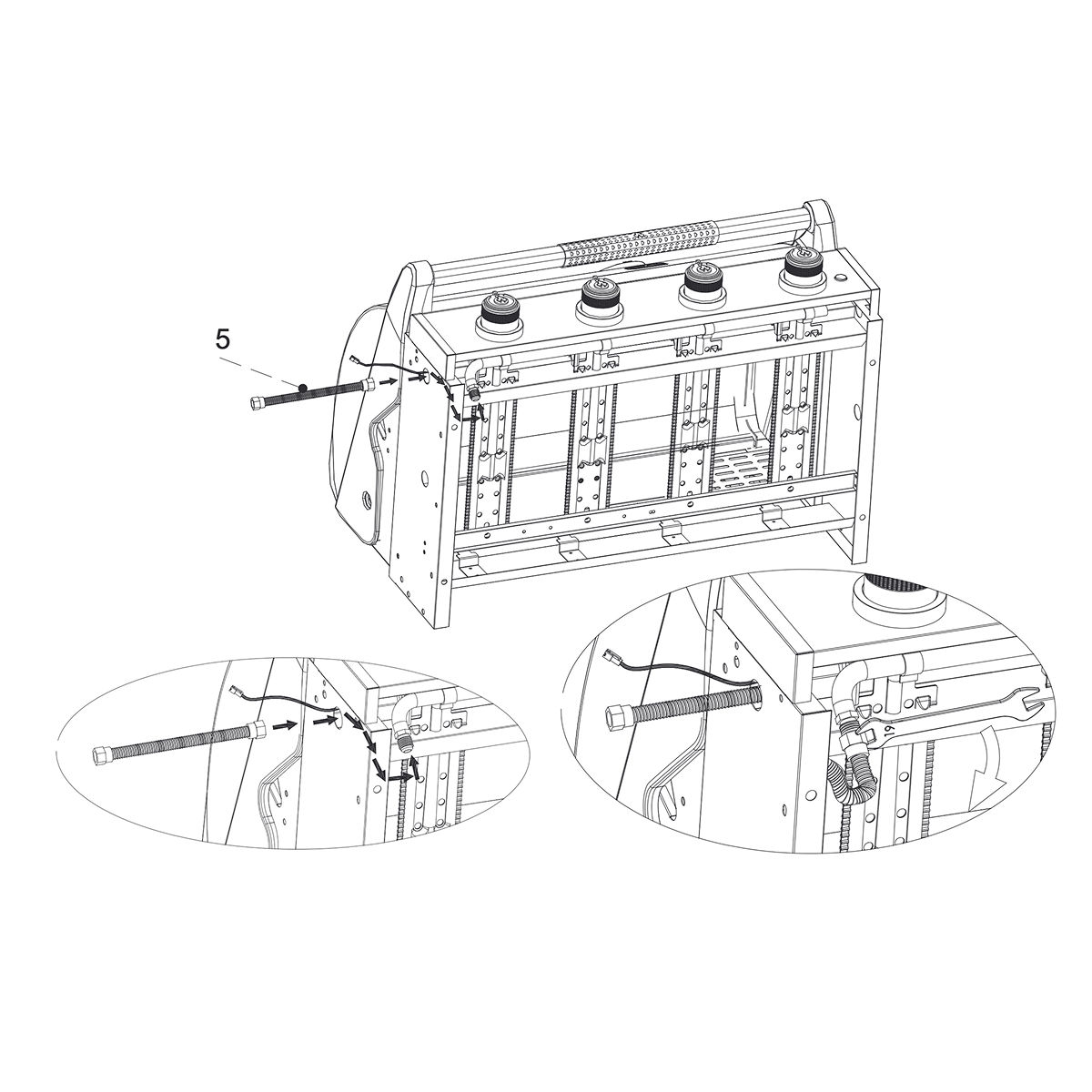 Connect the metal hose (5) to the main burner valve of the firebox assembly.
