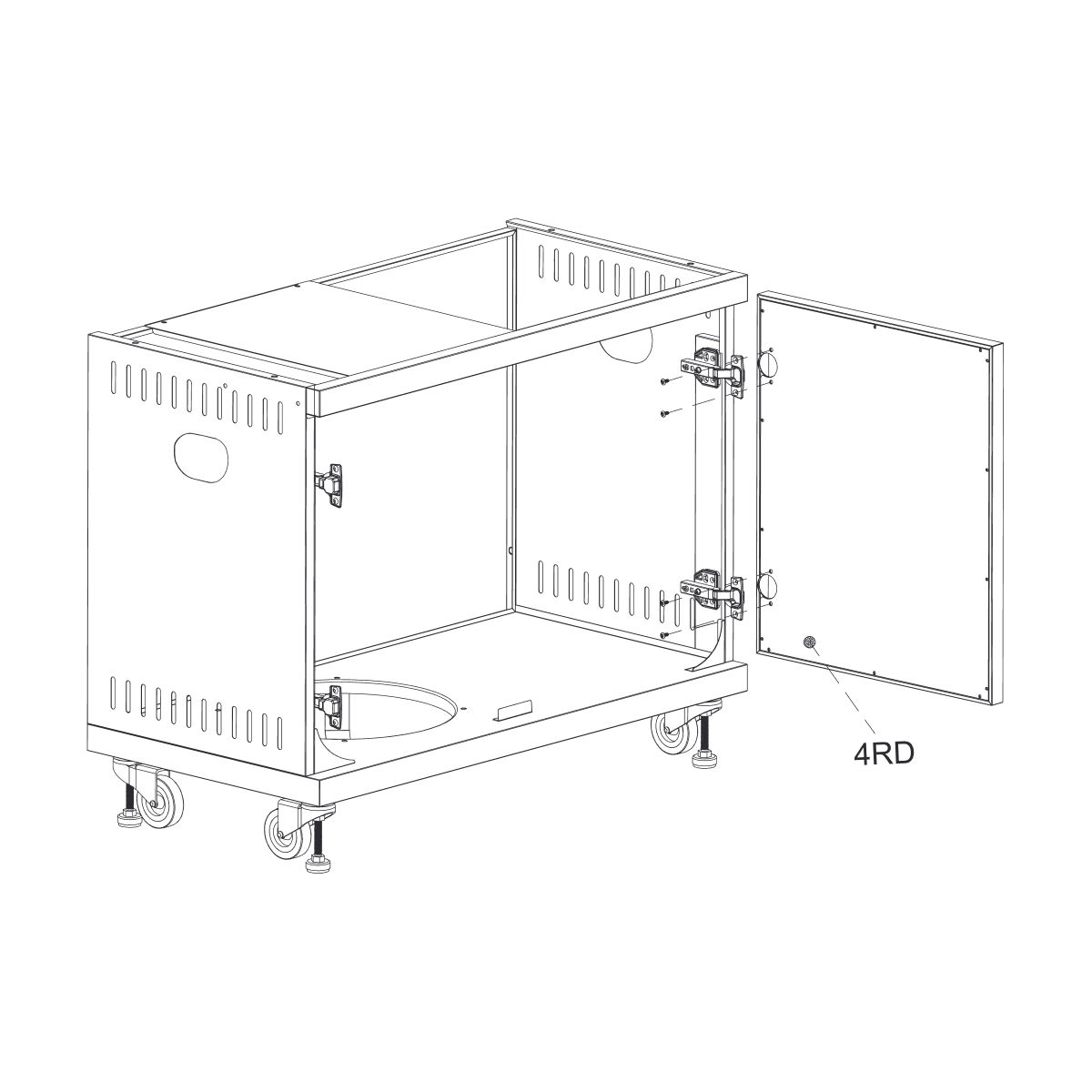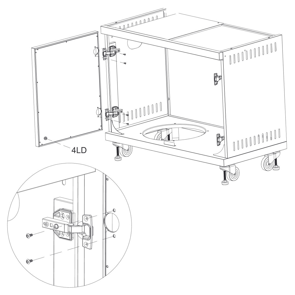 Hang the left door (4LD) and right door (4RD) onto the hinges (21) fixed to the side panels.