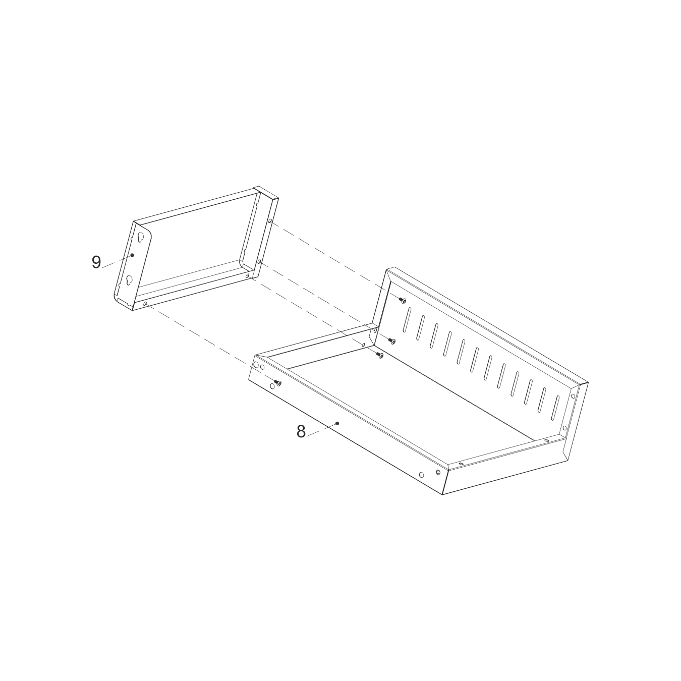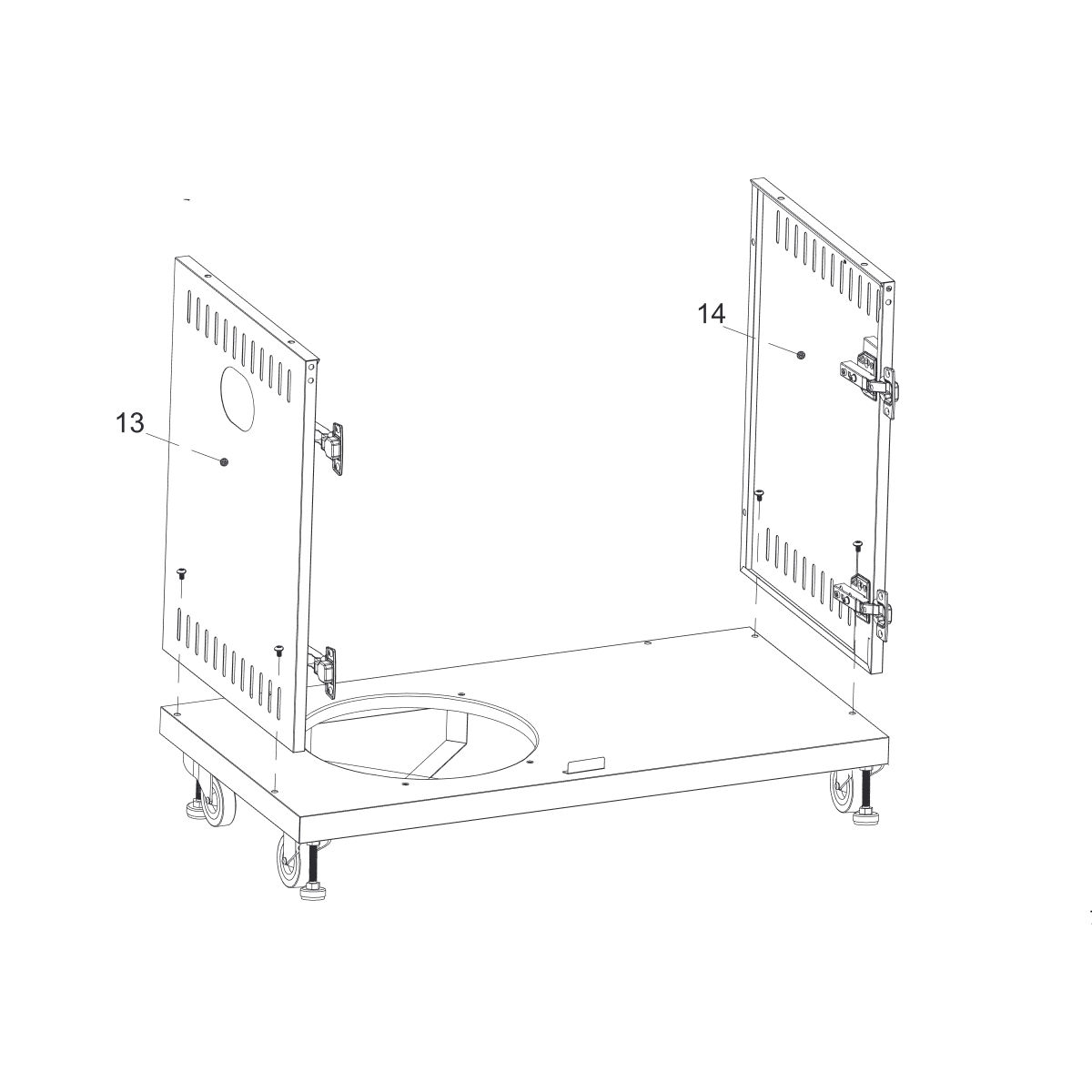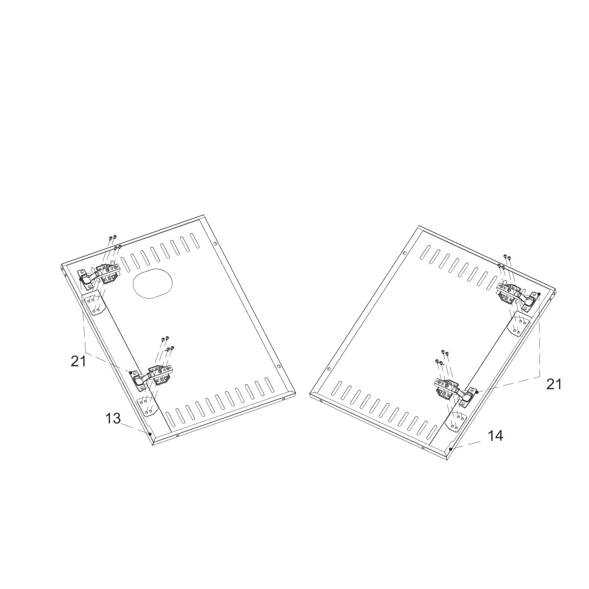 Attach 2 hinges (21) to the left side panel (13) and 2 hinges (21) to the right side panel (14).
