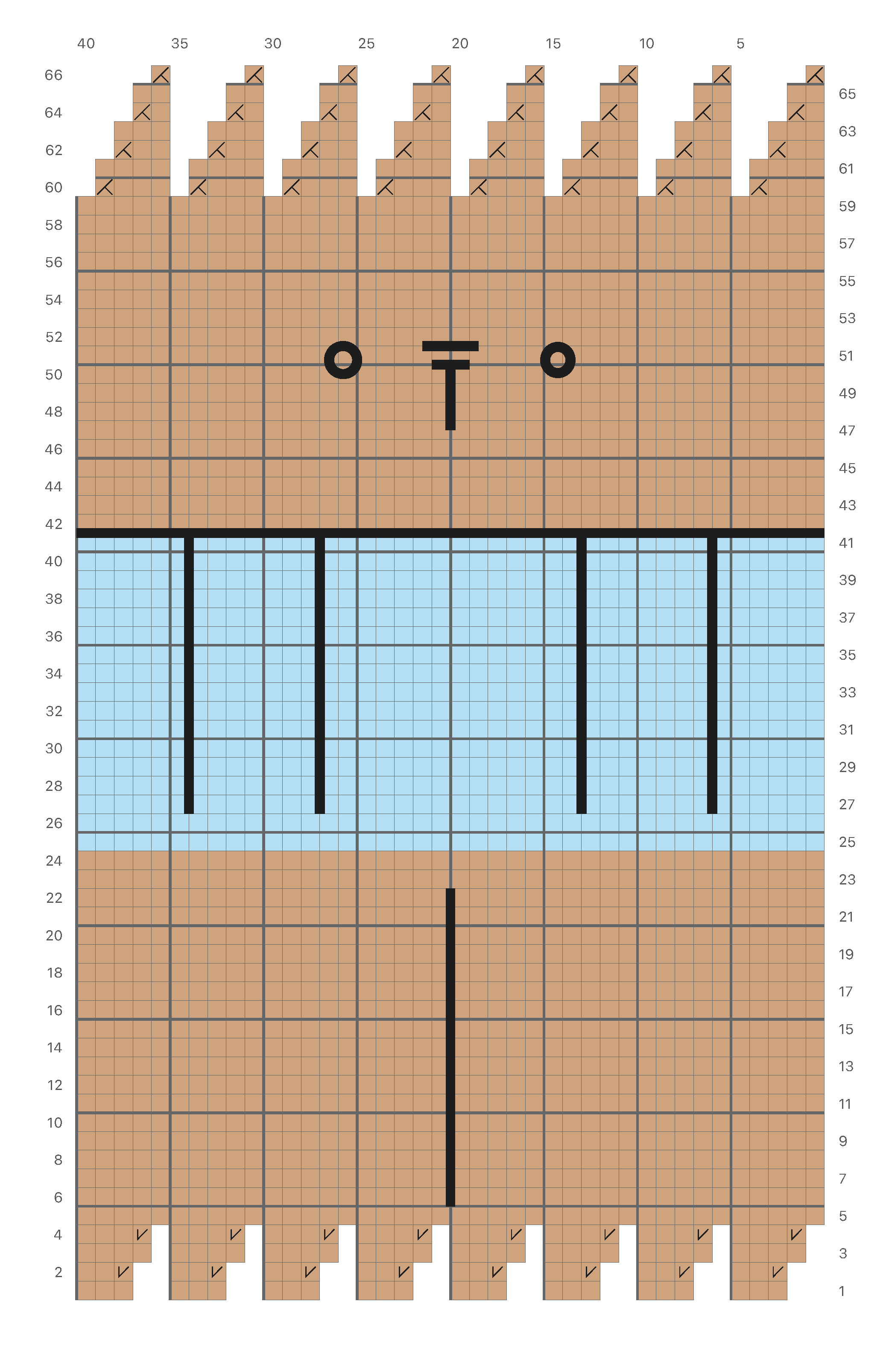 Cut off and leave a long yarn hanging. Pull the yarn end through the remaining sts on the needle and pull tight. Attach the safety eyes at row 50, leave 8 st between them. Embroider with black a nose between the eyes.