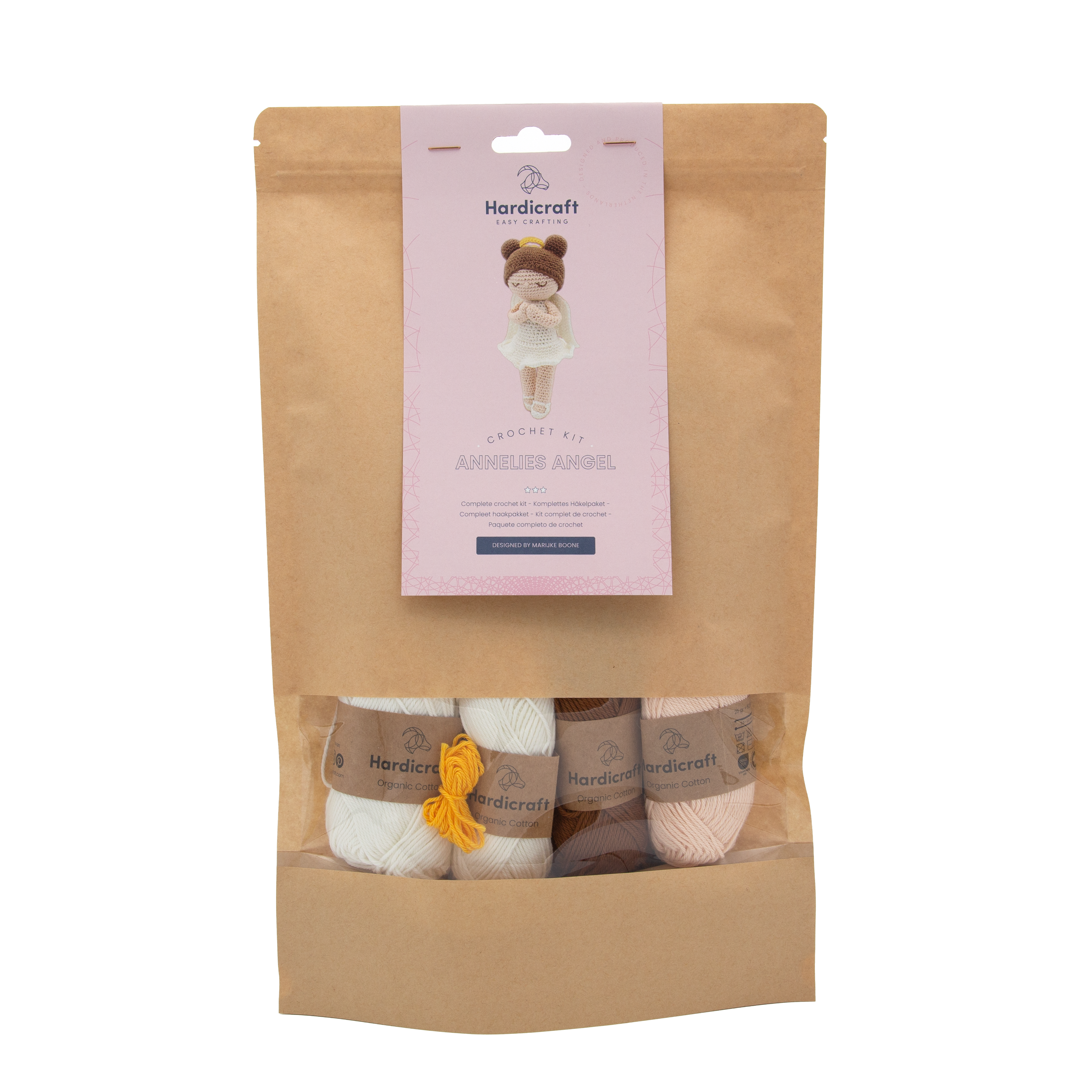 Embroider with brown the eyes at round 31, with 6 st between both eyes. Embroider with light pink a nose between the eyes.