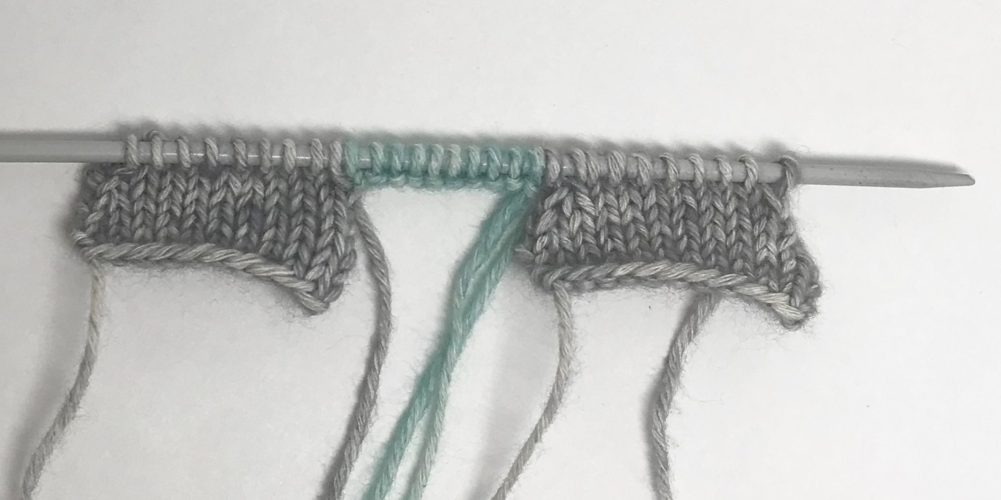 51. pfb with grey, p8 with grey, p3 with blue, p10 with grey, p3 with blue, p8 with grey, pfb with grey (= 36 sts)
