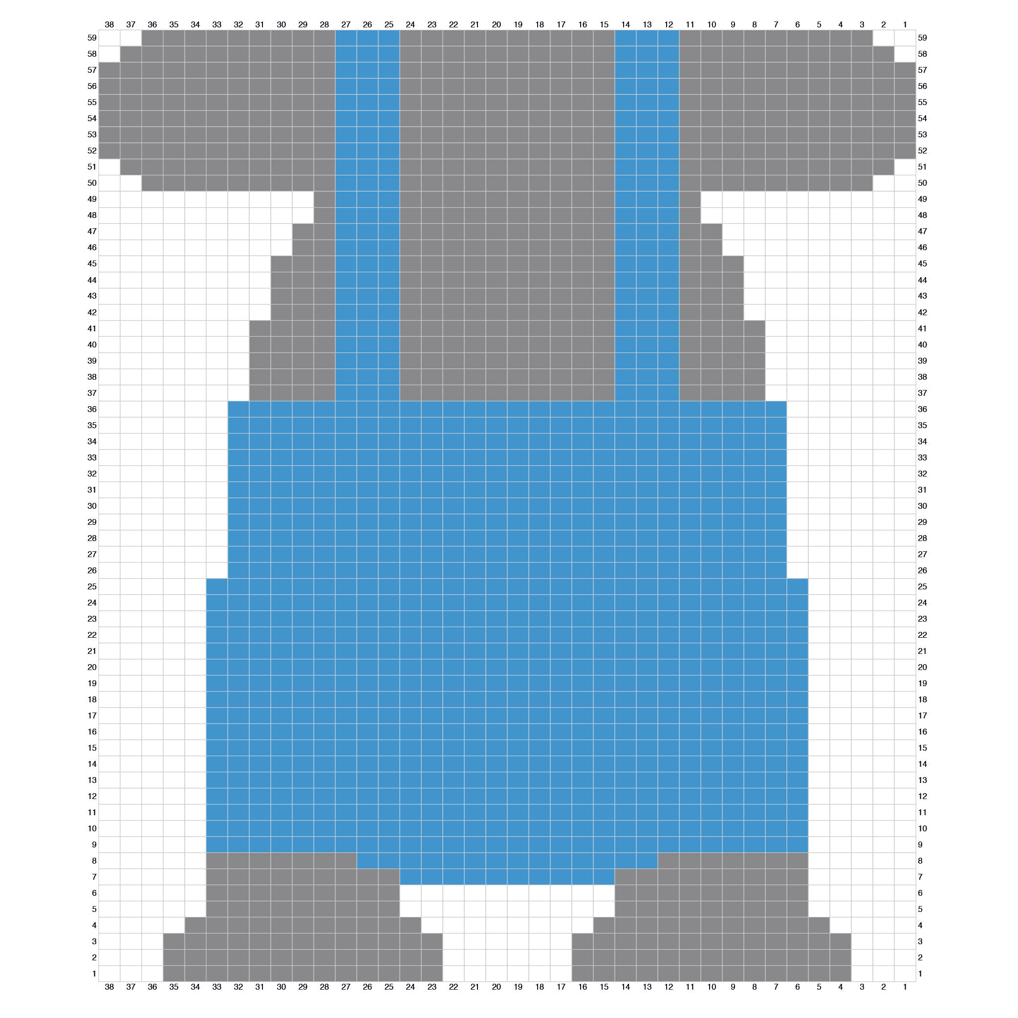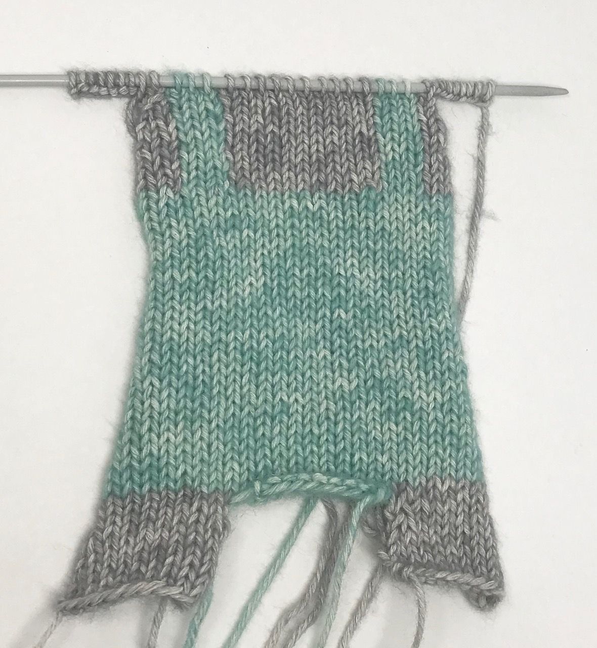 59. p2tog with grey, p8 with grey, p3 with blue, p10 with grey, p8 with grey, p2tog with grey (= 34 sts)