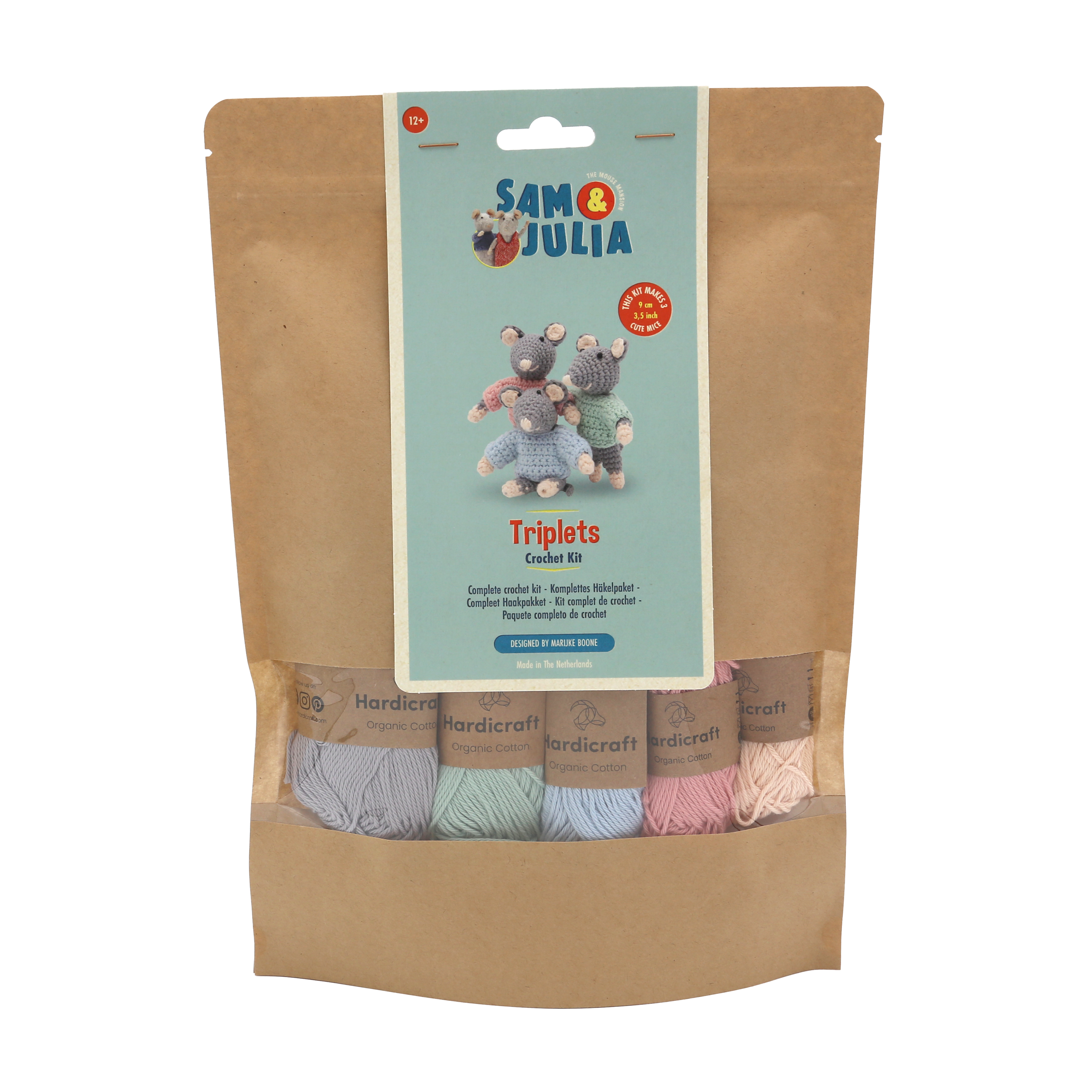 The sweaters of the triplets are crocheted in back and forth rows.