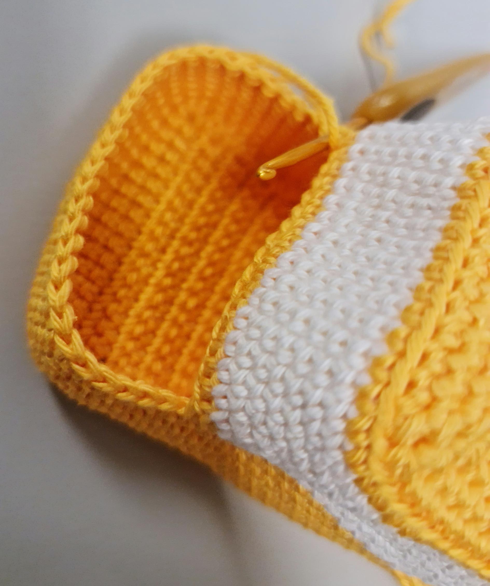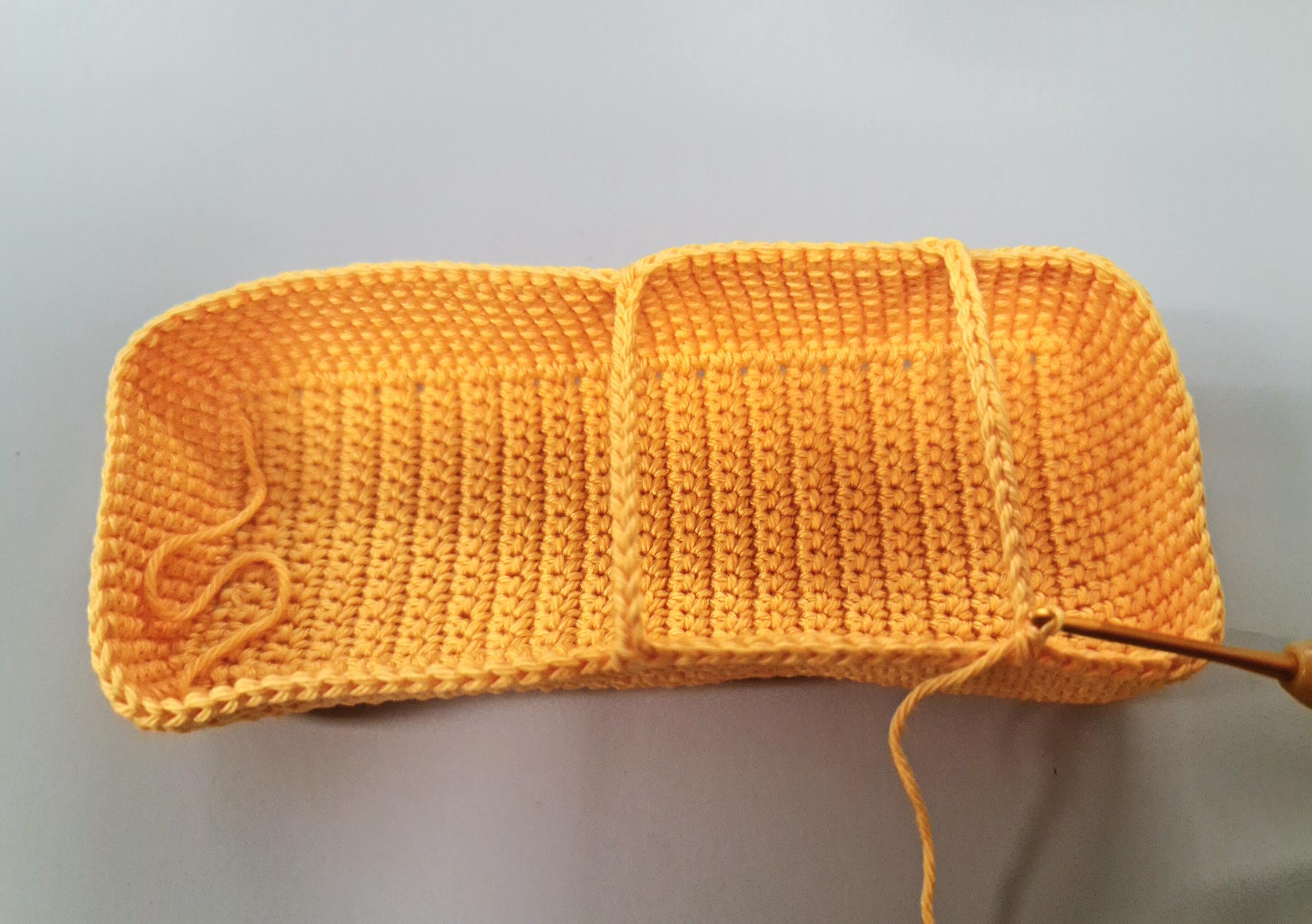 Start at the bottom. The bottom is crocheted in rows. Ch 1 after each row and turn around.