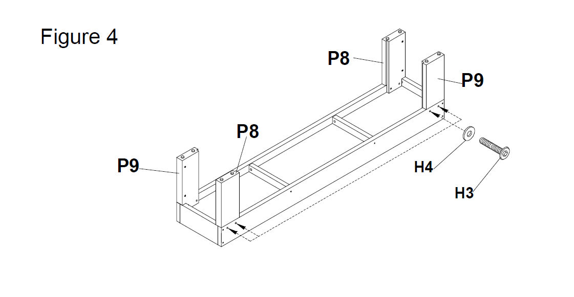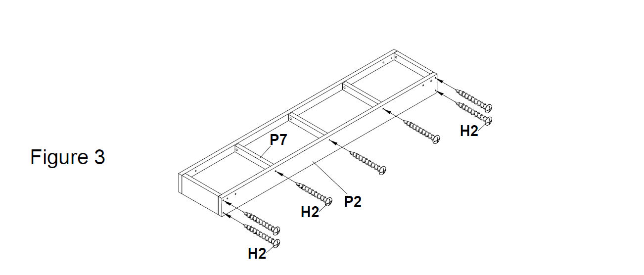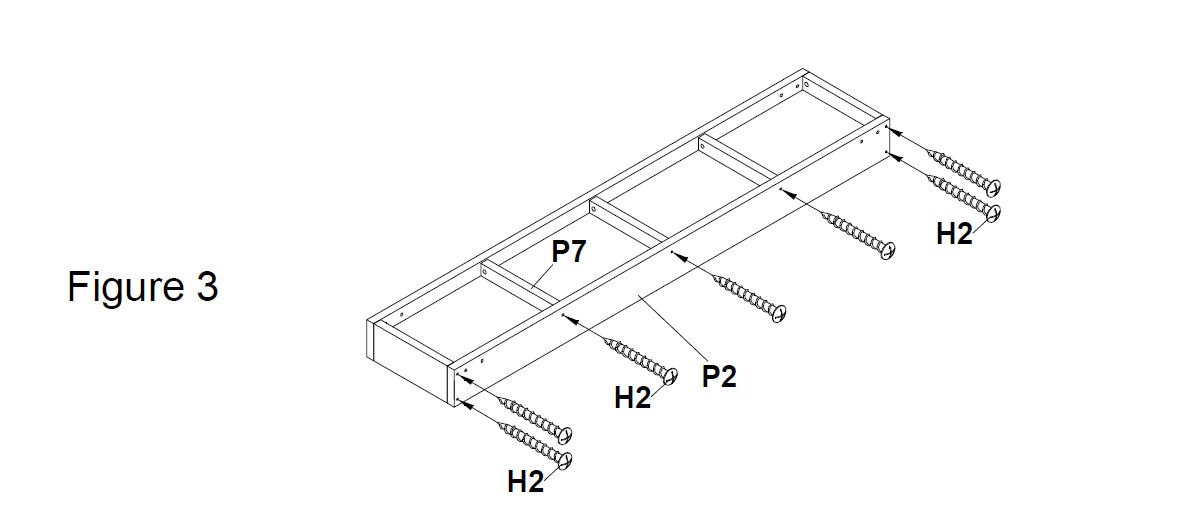 Use 50mm screws (H2) to attach the Support Braces (P7) across the underside of the bench. (Figure 3).