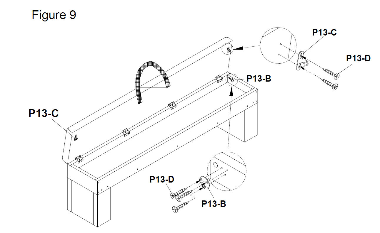 First, position part (P13-C) to the inside top corners of the seat panel and secure each in place with screws(P13-D).