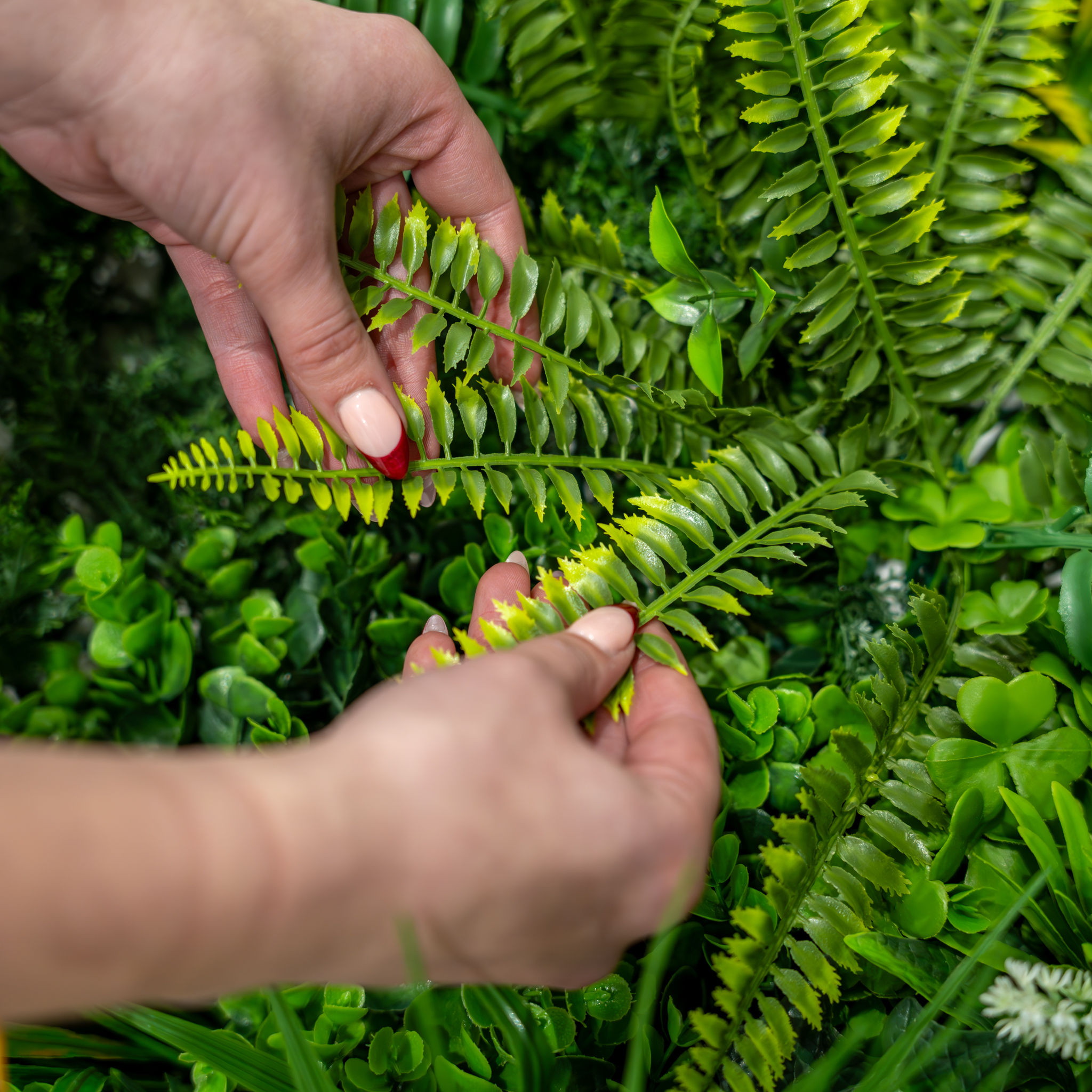 Once your artificial wall panel has been securely fitted to the wall, take a few moments to enhance its appearance. During shipping, the flowers and leaves may become compressed or uneven to ensure their protection. Gently spread out and reshape the foliage to achieve a natural and full appearance.