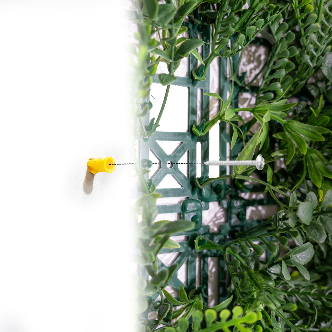 Fit the wall plug to the surface you wish to attach the artificial living wall to. Screw the wall tile to the wall plug using the screws to secure the tile throught the holes in the mesh of the wall tile.