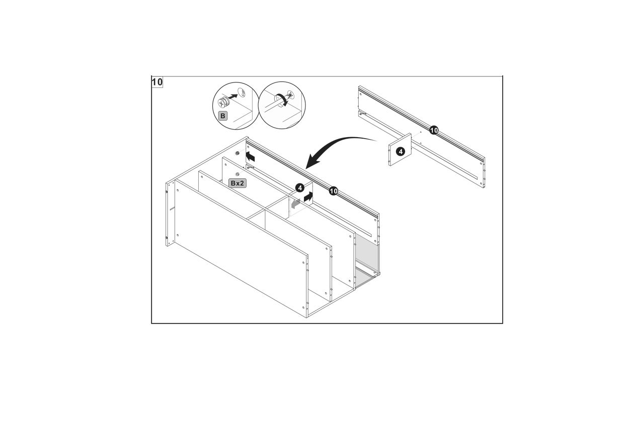 Use the connector screws labeled B to attach the panel 10 to the main structure. Ensure the screws are tightened properly for stability.