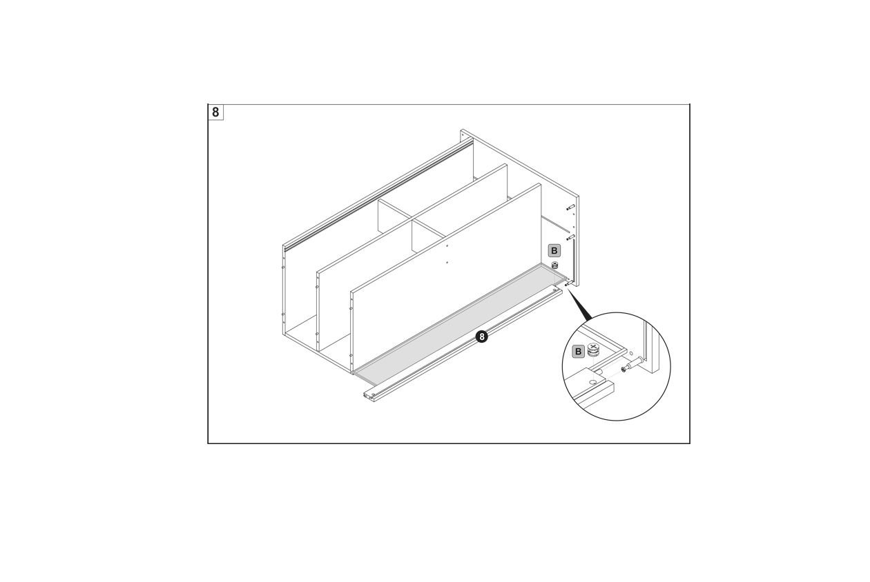 Secure the base panel using connector screws (B) as shown in the detailed view.