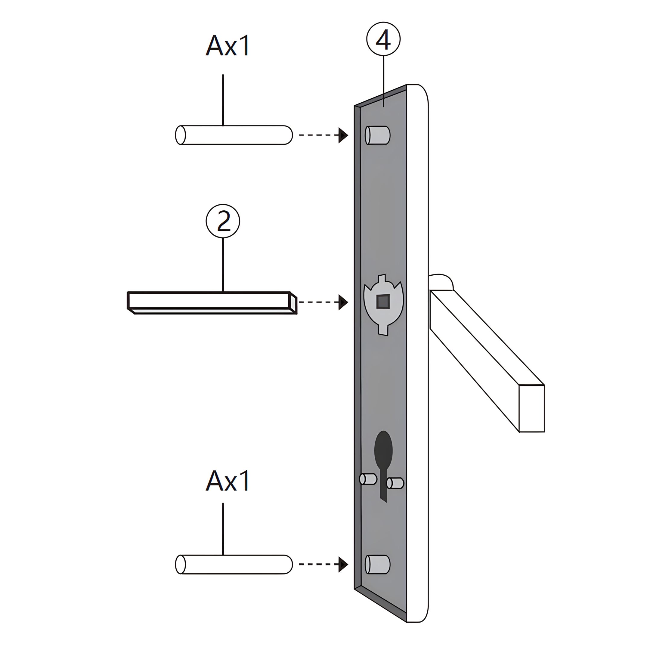Insert the Connecting Rod (Lock Part A) through the designated holes on the Lock Handle Back Panel (Lock Part 4).