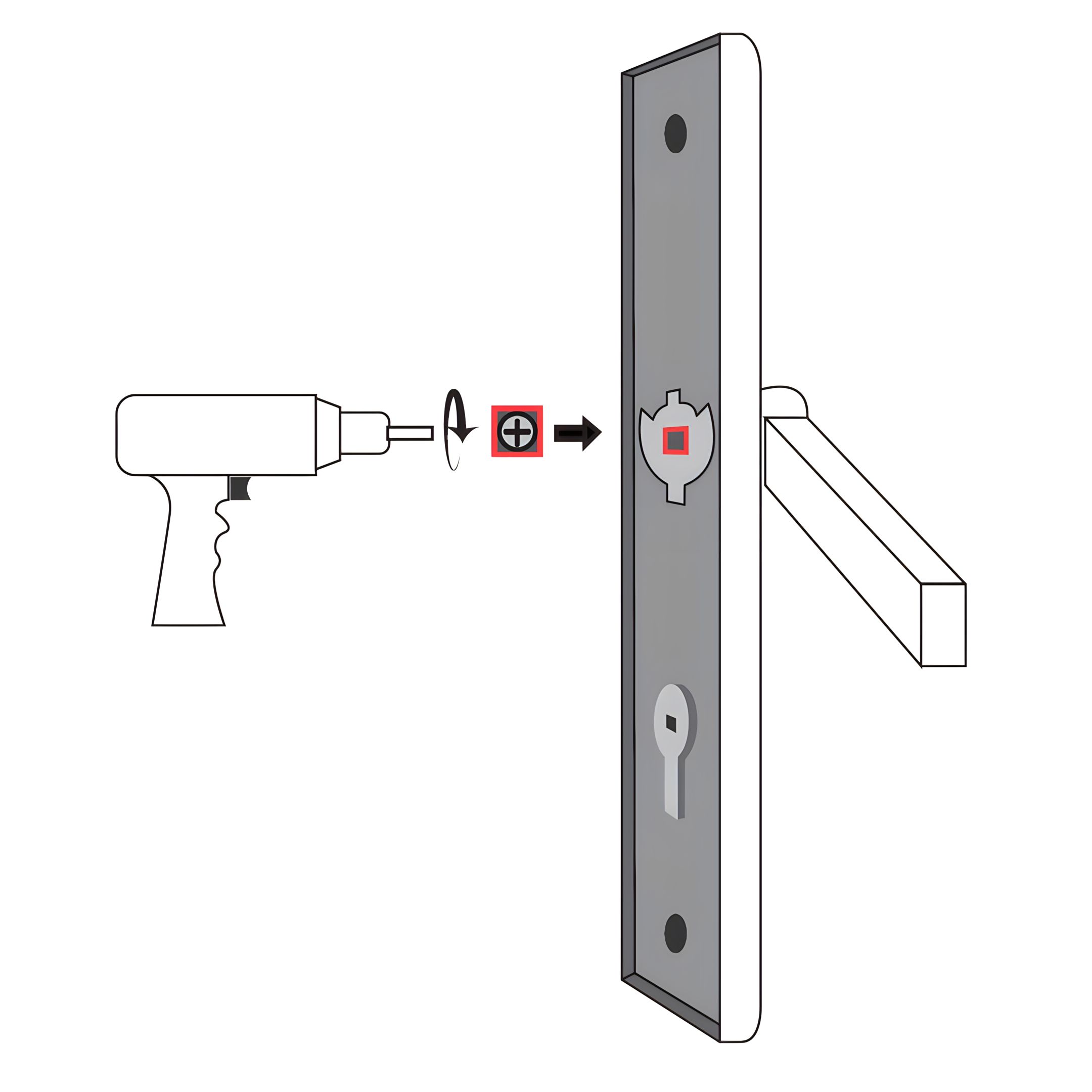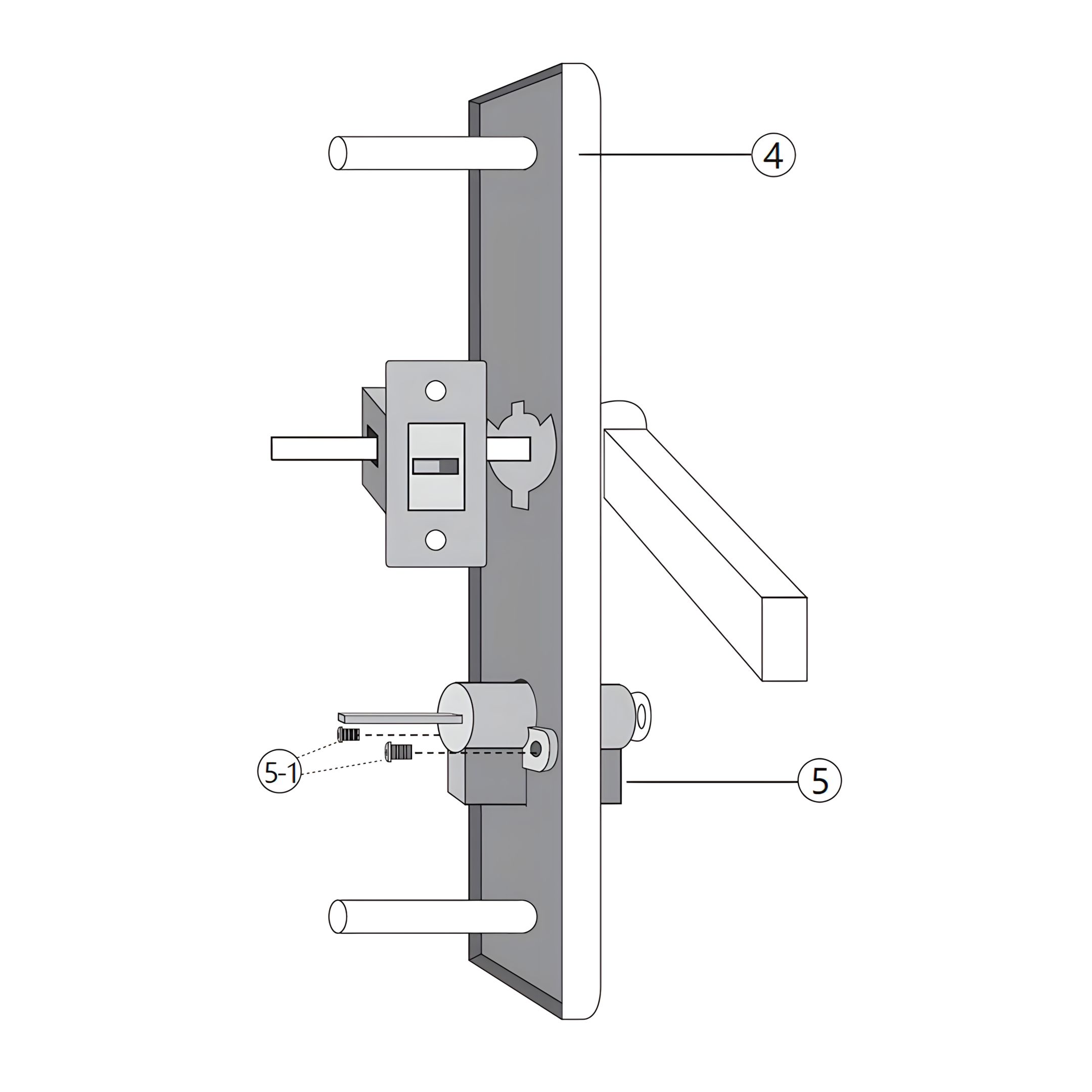 Secure the Key Mechanism (Lock Part 5) into the designated slot on the back handle using the Key Mechanism Screws (Lock Part 5-1).