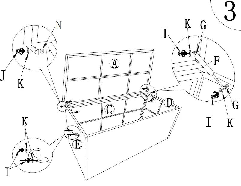 Use screws (I) and the washers (K) to secure it.
