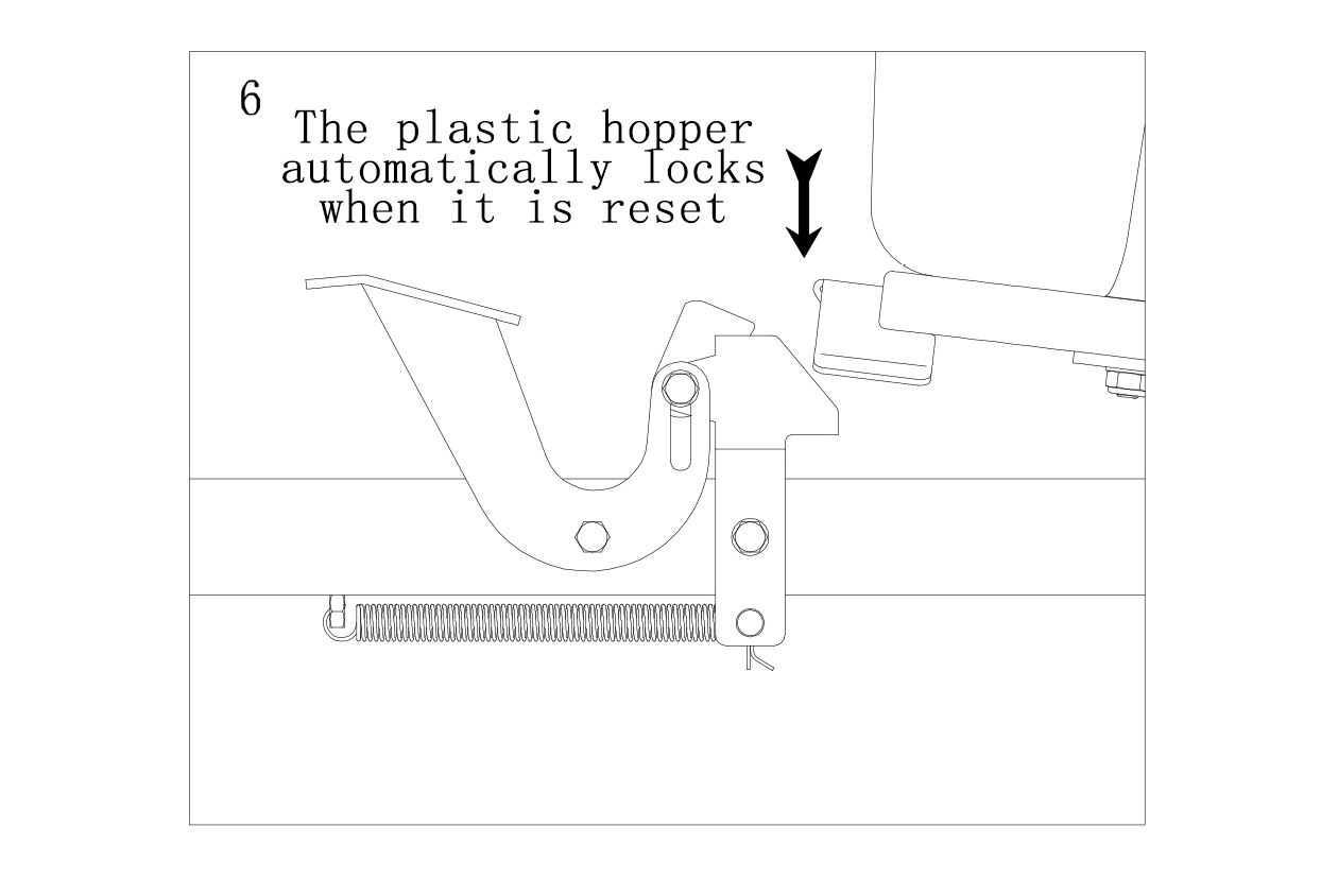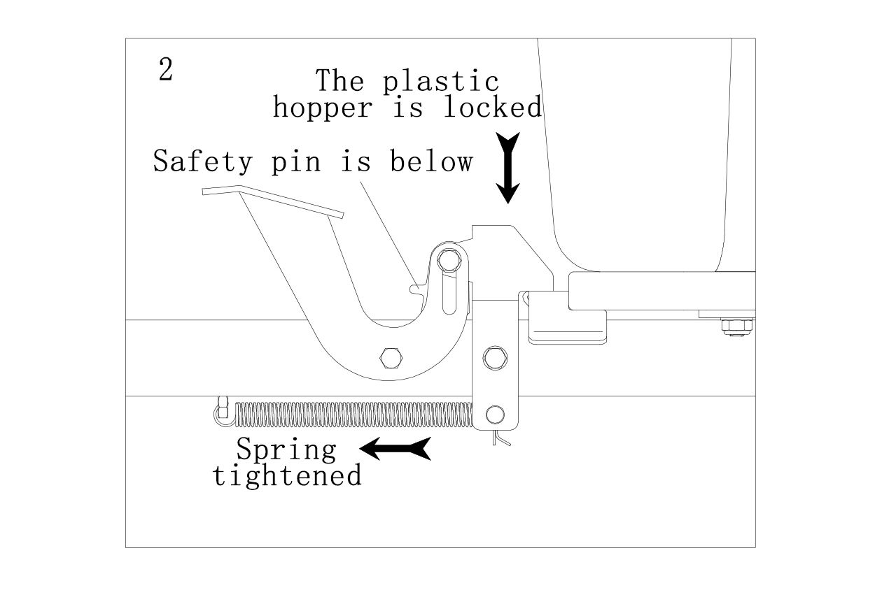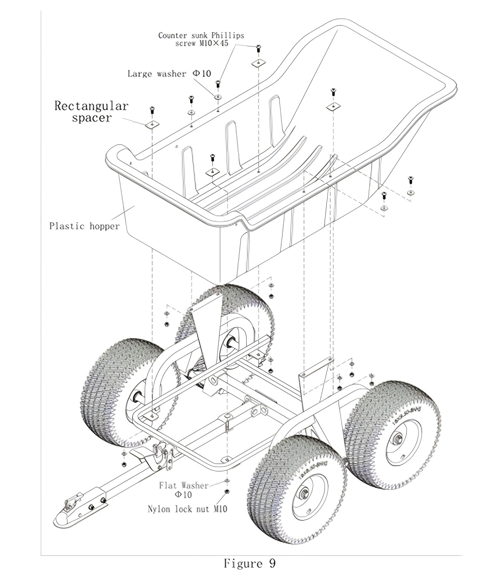 As shown in Figure 9, use 8 x Counter Sunk Phillips Screws M10x45, 8 x Flat Washers φ10, 4 x Large Washers φ10, 8 x Nylon Lock Nuts M10 and 4 x Rectangular Spacers to install the hopper to the Hopper Bottom Frame.