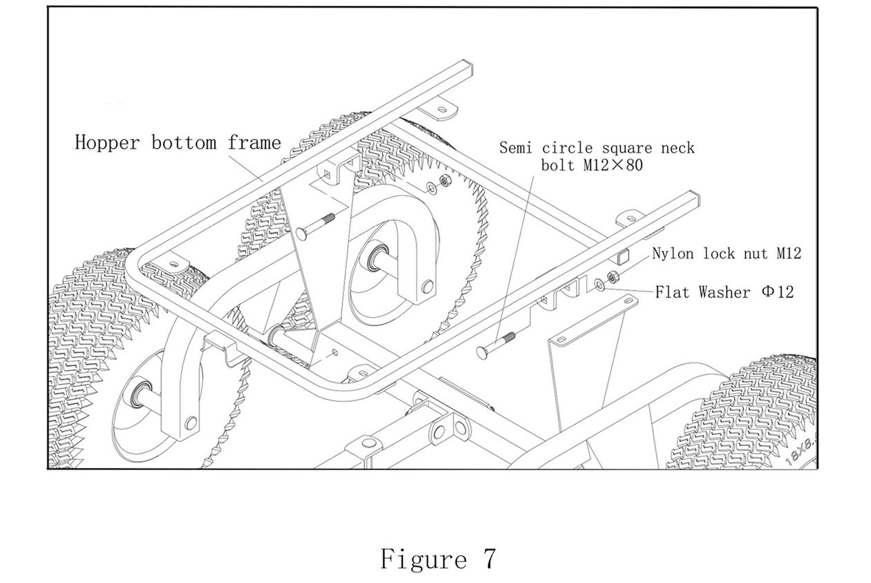 As shown in Figure 7, use 2 x Semi Circle Square Neck Bolts M12x80, 2 x Flat Washers φ12, and 2 x Nylon Lock Nuts M12 to install the Hopper bottom frame and the frame of the body together (see Figure 8).