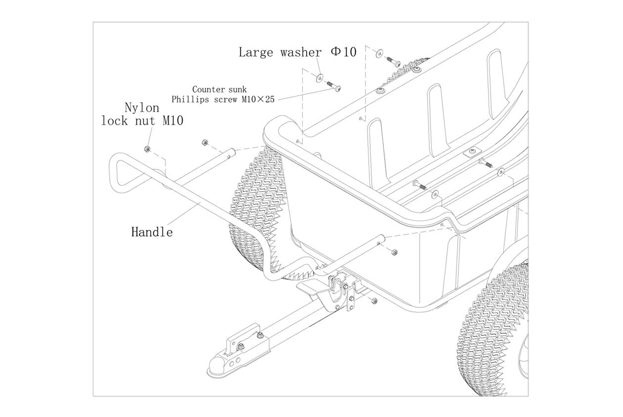 As shown in Figure 10, install the Handle to the body with 4 x Counter Sunk Phillips Screws M10x25, 4 x Large Washers φ10, and 4 x Nylon Lock Nuts M10. Assembly is complete.