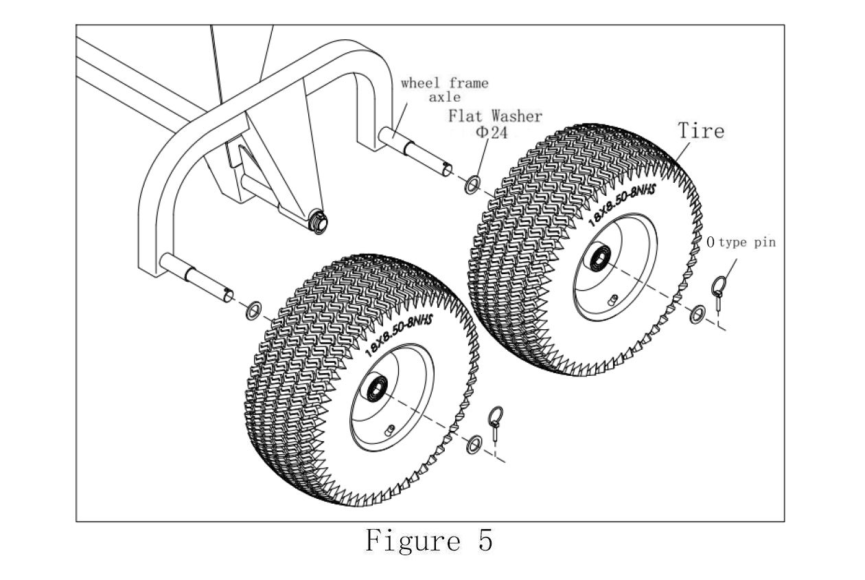 As shown in Figure 5, use 2 x Flat Washers φ24 and 1x 0 type pin to install one Tyre on the Axle of the Wheel Frame. The tyre's inflation nozzle is on the outside. Then install the second Tyre and use the same method on the other side. Install 2 Tyres (see Figure 6).