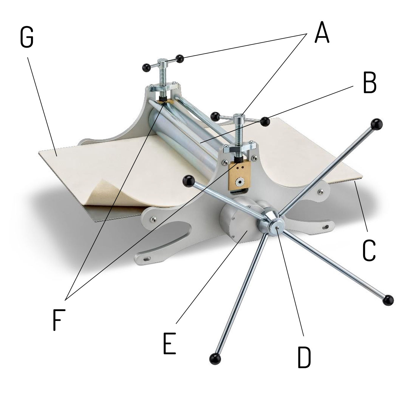 - A steel structure with a smooth upper roller with a diameter of 100 mm and a knurled lower drive roller with a diameter of 80 mm.