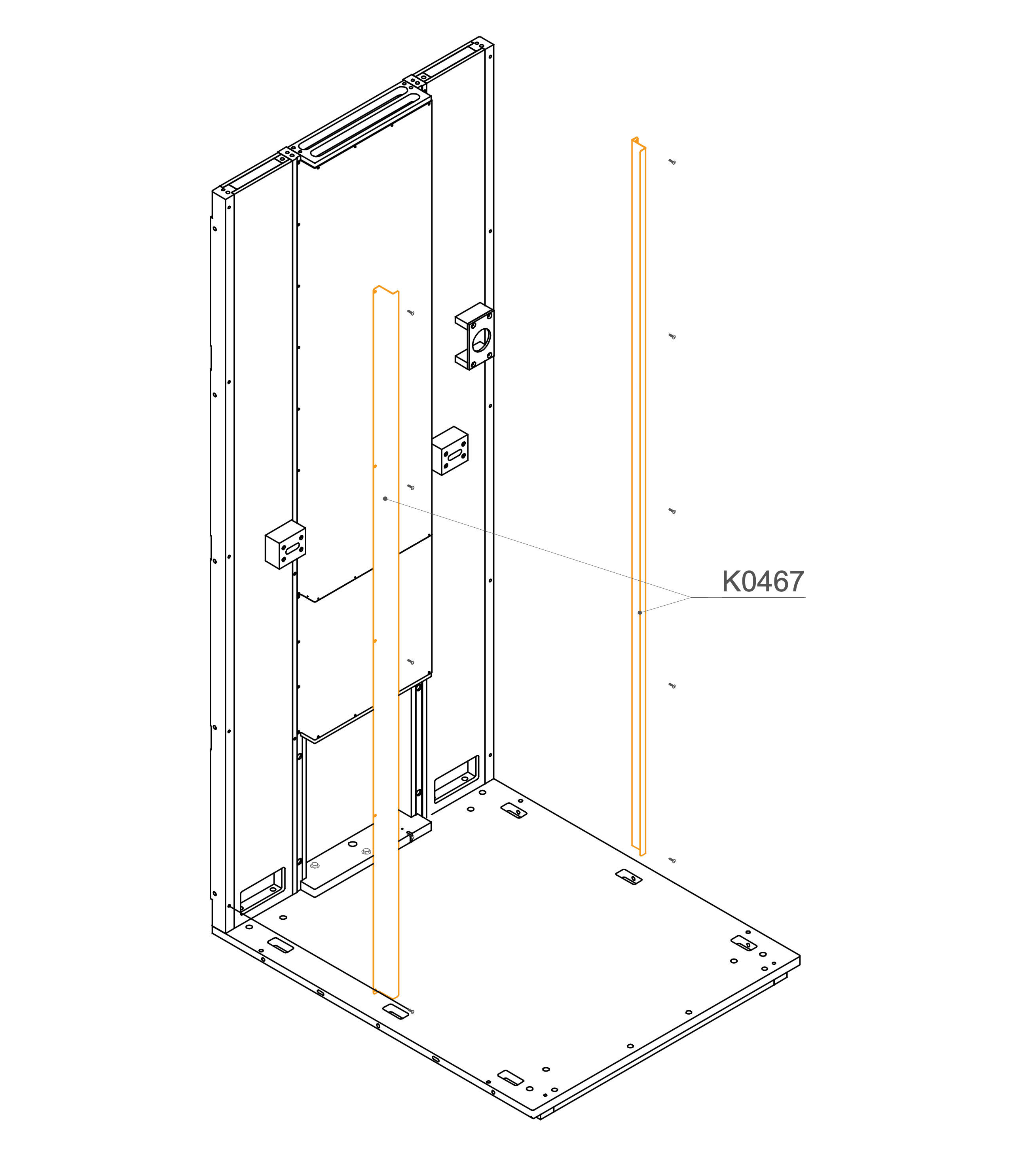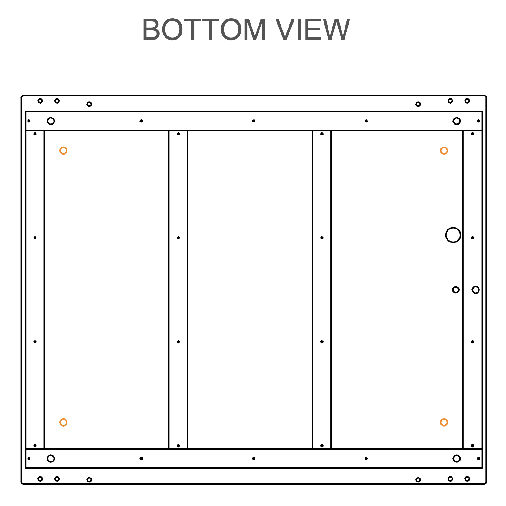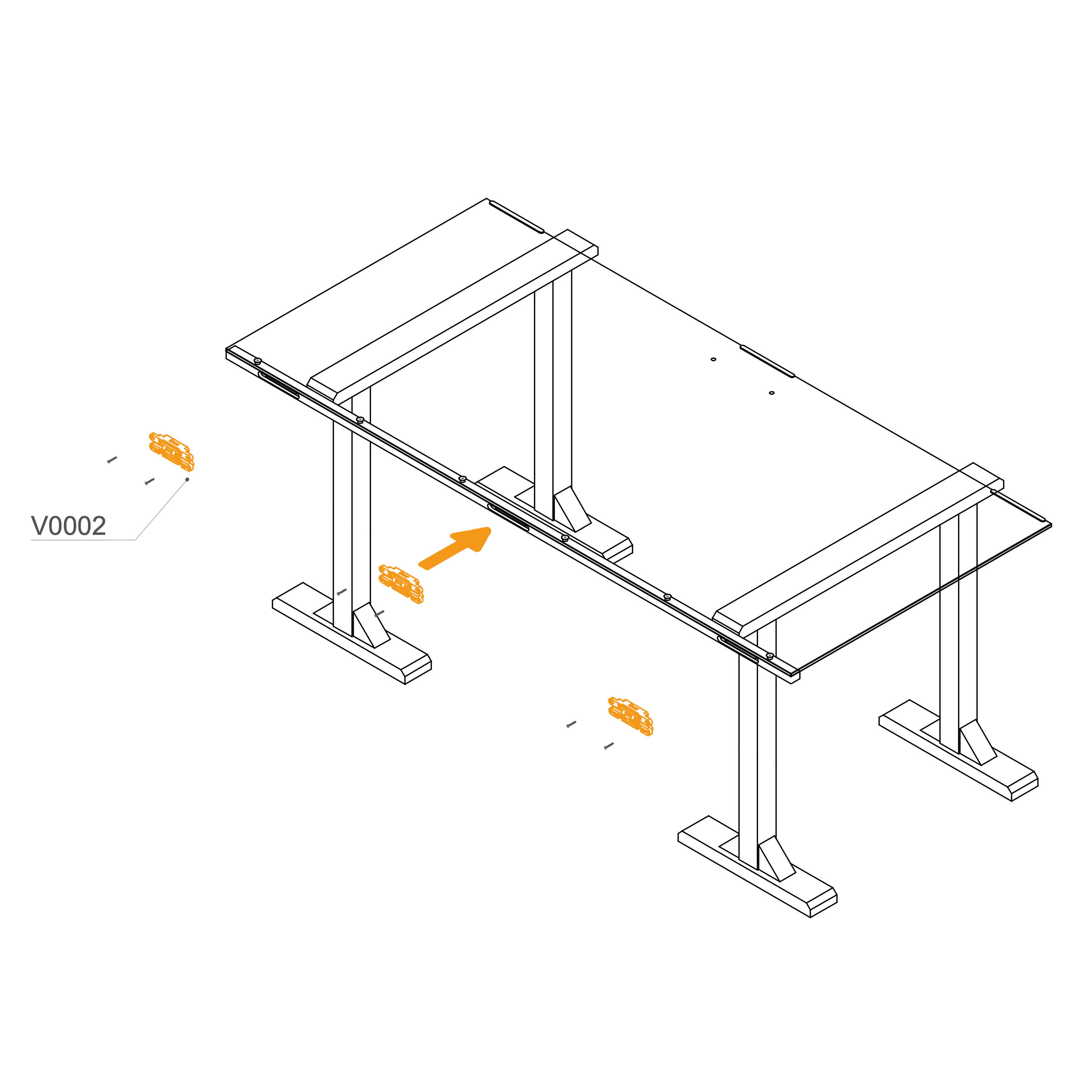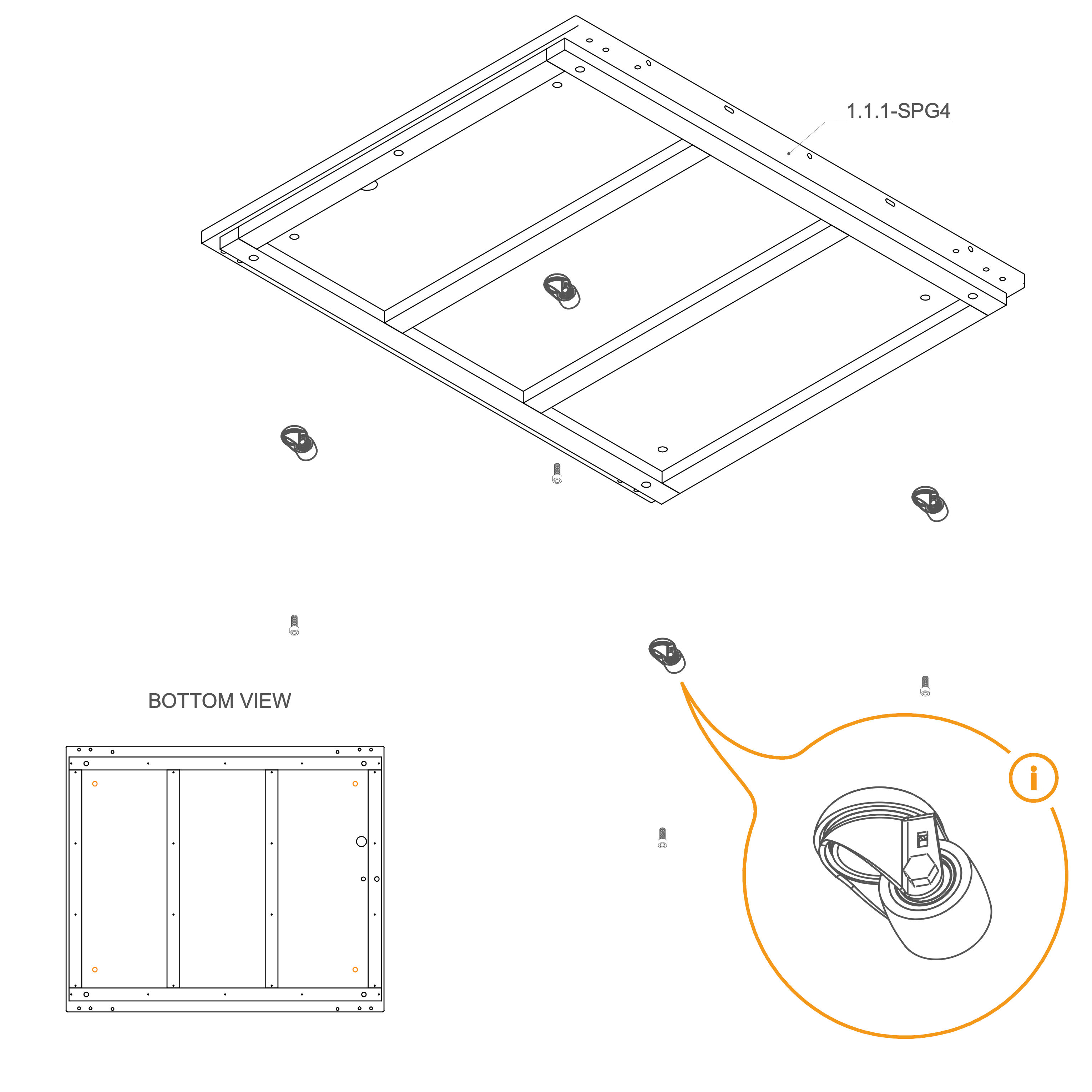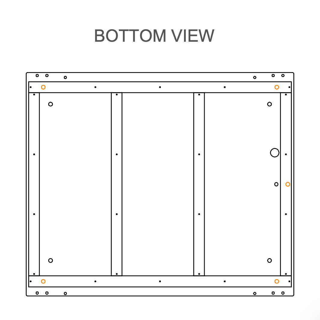 Use the marked holes in the picture to insert M10×25 mm screws (T0509). If your order includes wheels (V0181), attach them to the same holes using the M10×25 mm screws (T0509).