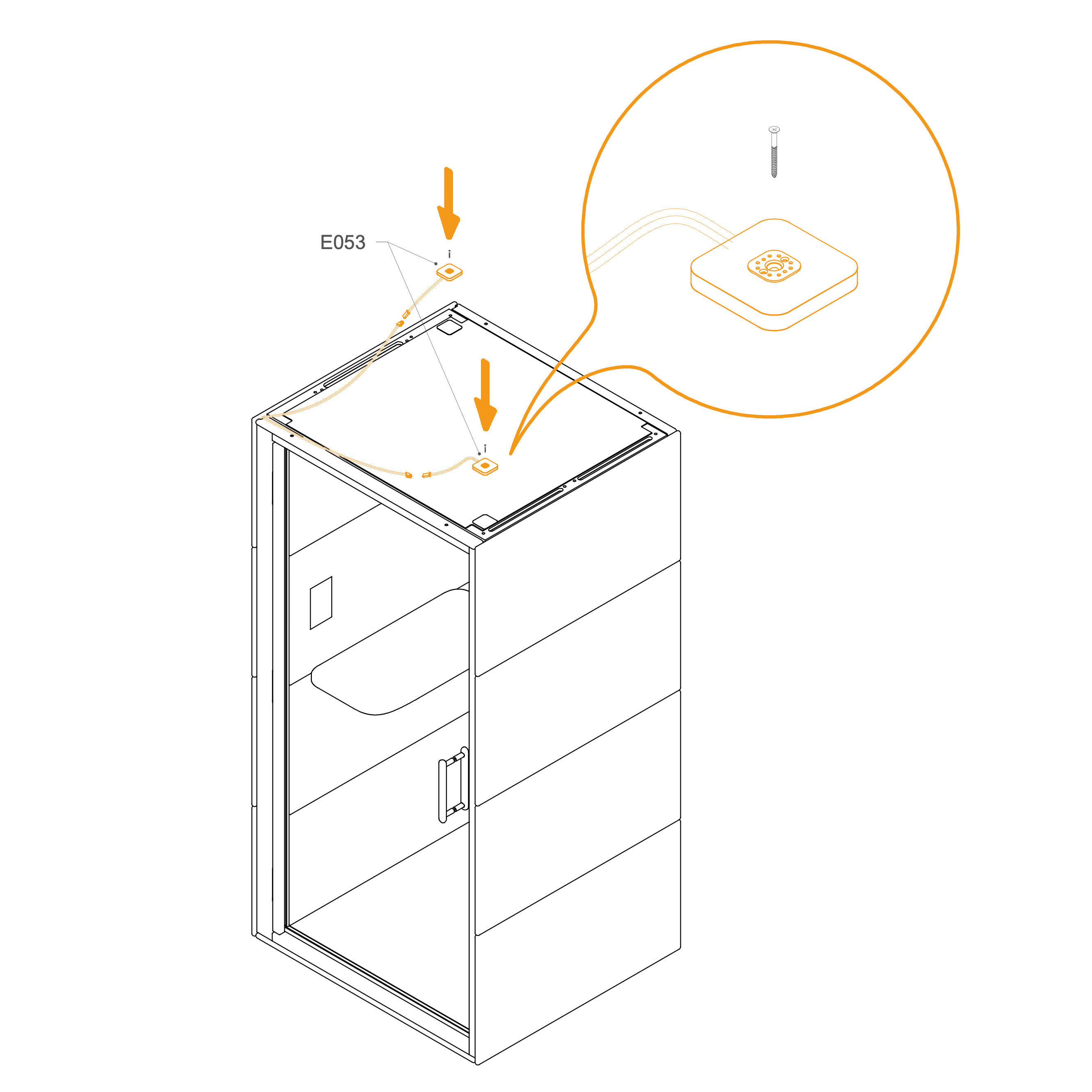 Secure the occupancy light (E053) to the frame with the provided screws.