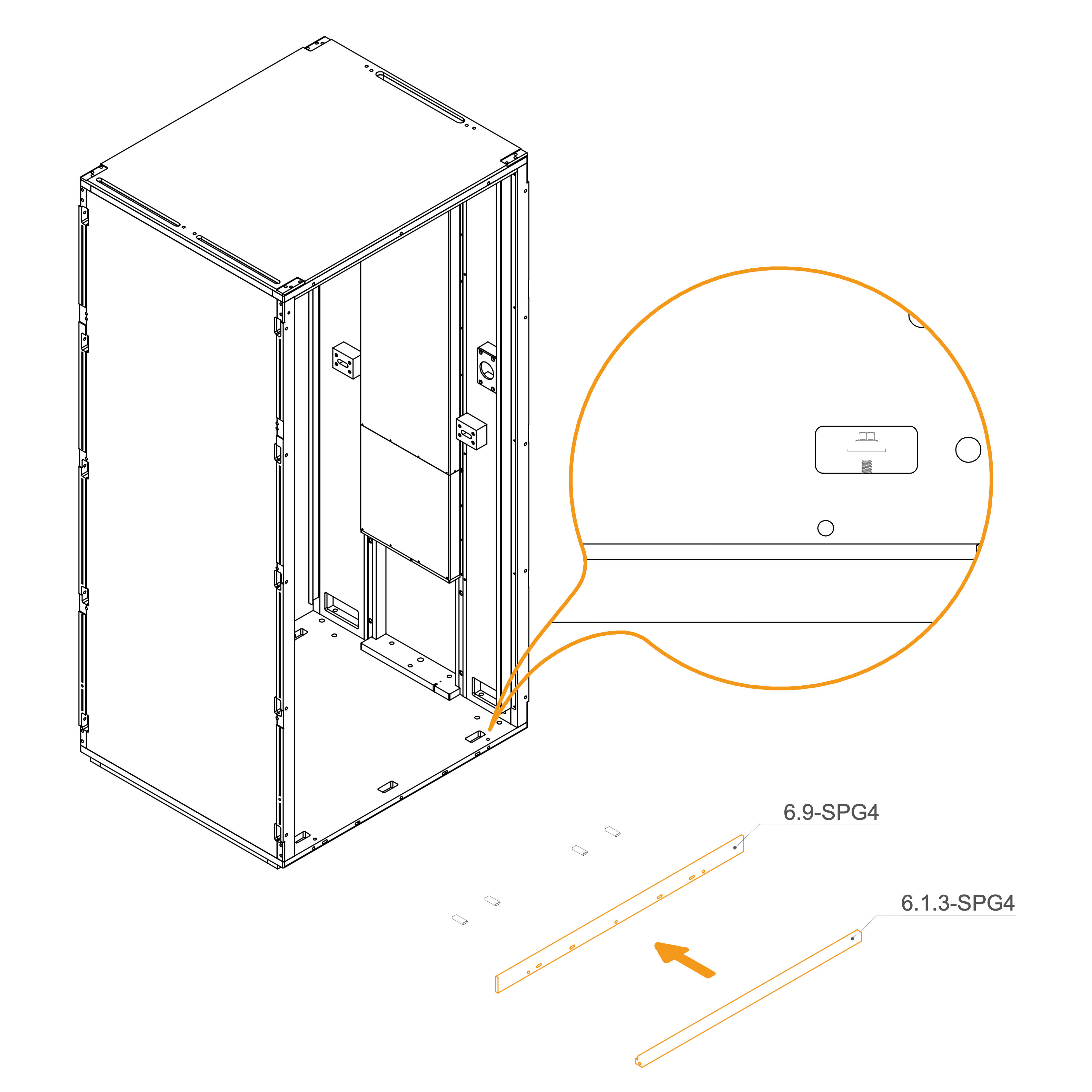 Align the horizontal frame 6.9-SPG4 and 6.1.3-SPG4 with the mounting slots at the rear edge of the floor panel.