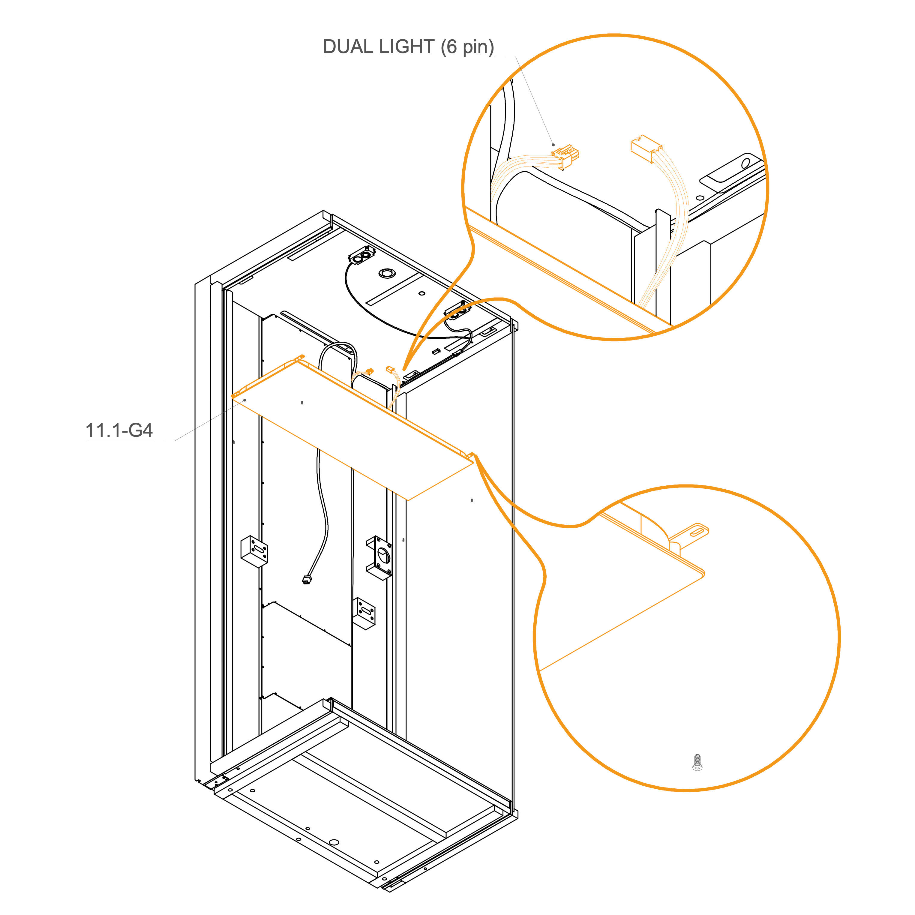Place the internal panel (7.1-SP, CH2G4) over the power cord section and secure in position.