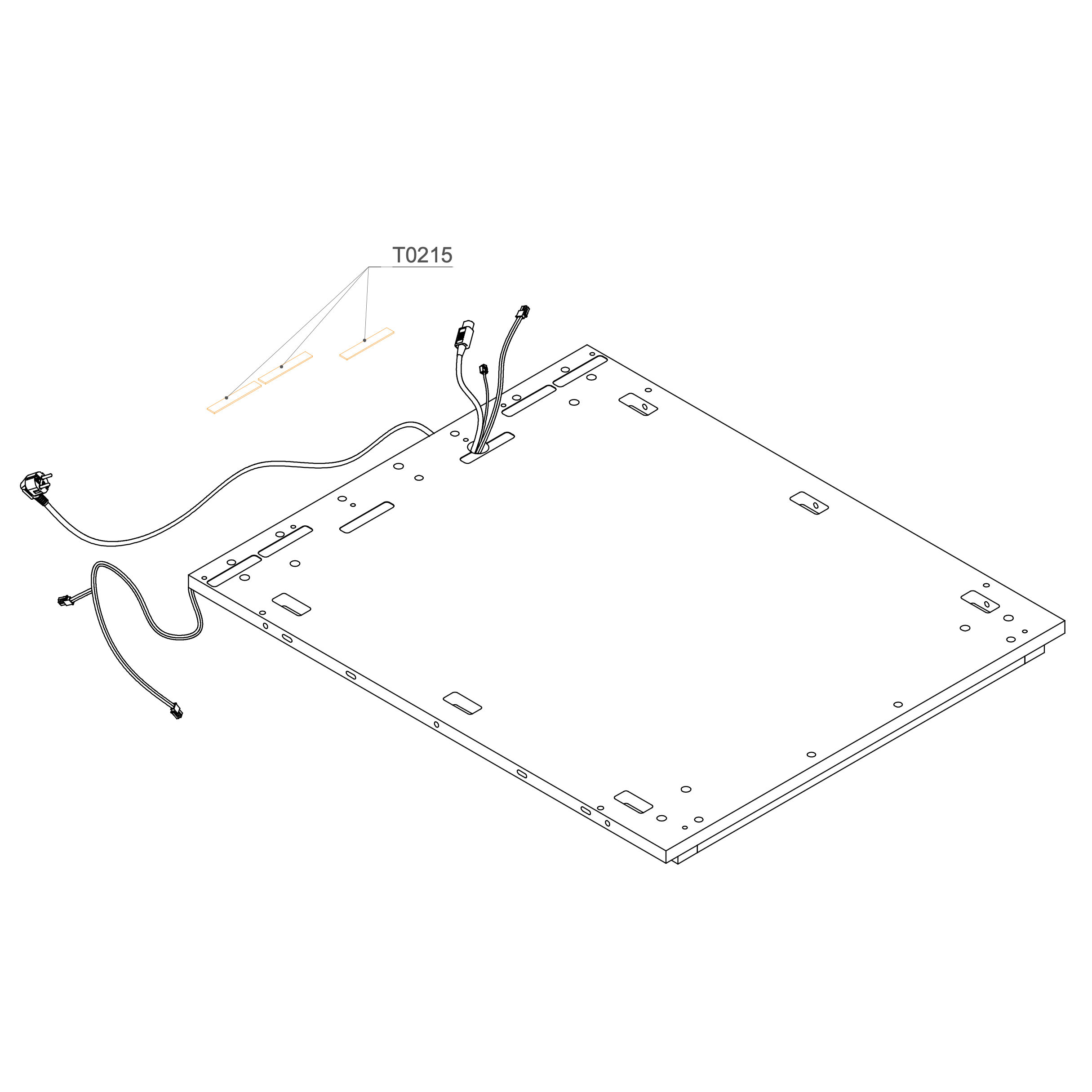 Lay the GEN4_ELEKTRO_CABLE OCCUPANCY SIGNALIZATION 4600 mm (E0816), LAN cable (RJ45), and power cord through the hole in the floor panel. Follow the marked path shown in the bottom view, ensuring the cables are not pinched.