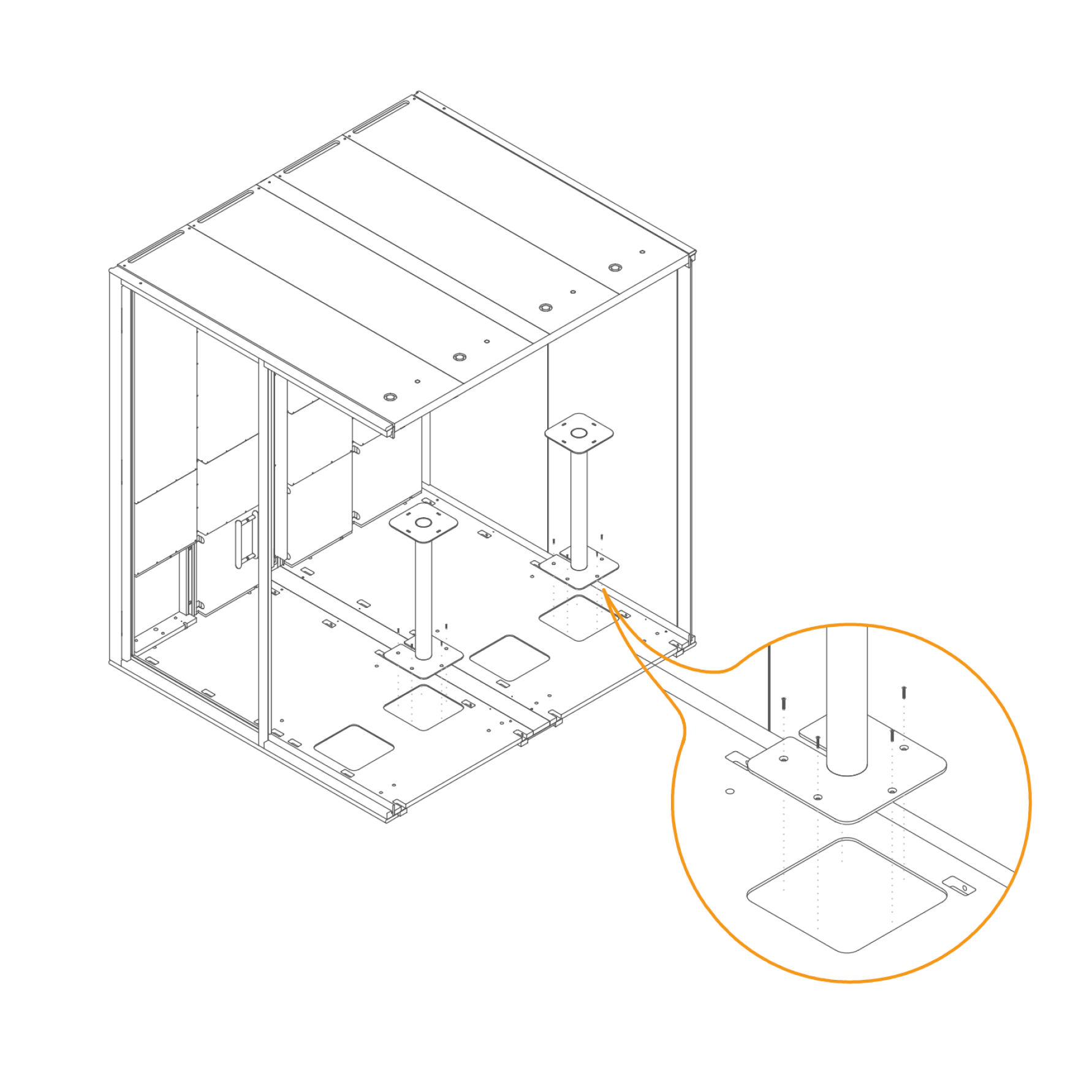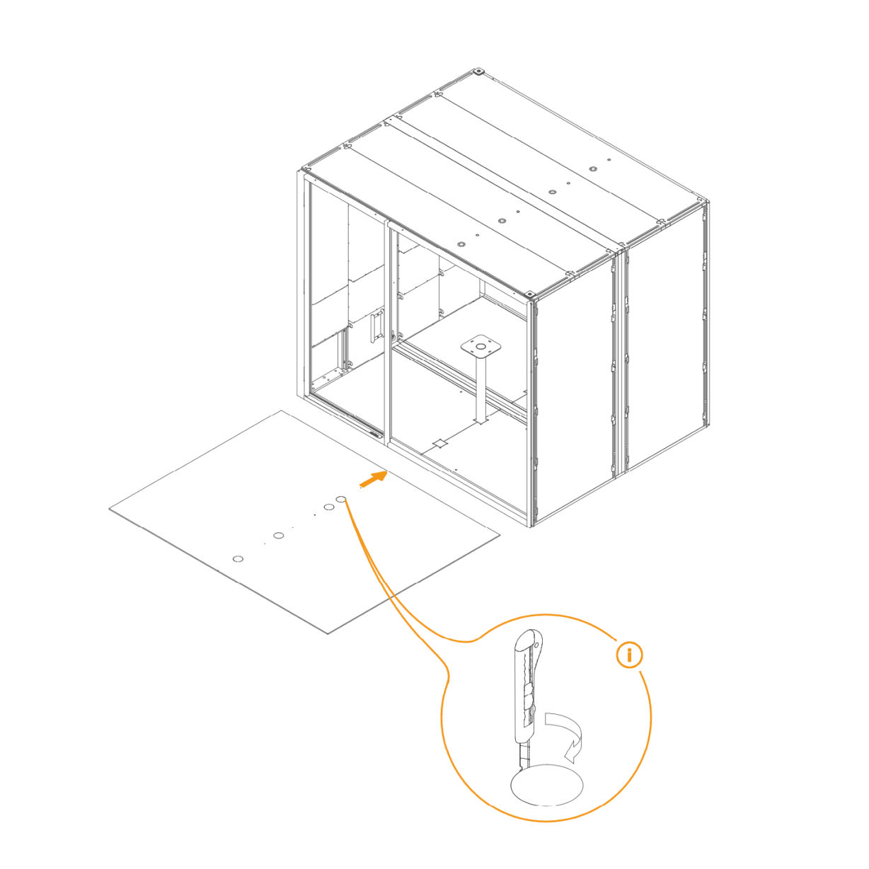 Insert one levelling foot (V0050) into each of the 16 marked holes on the underside of the floor panels.