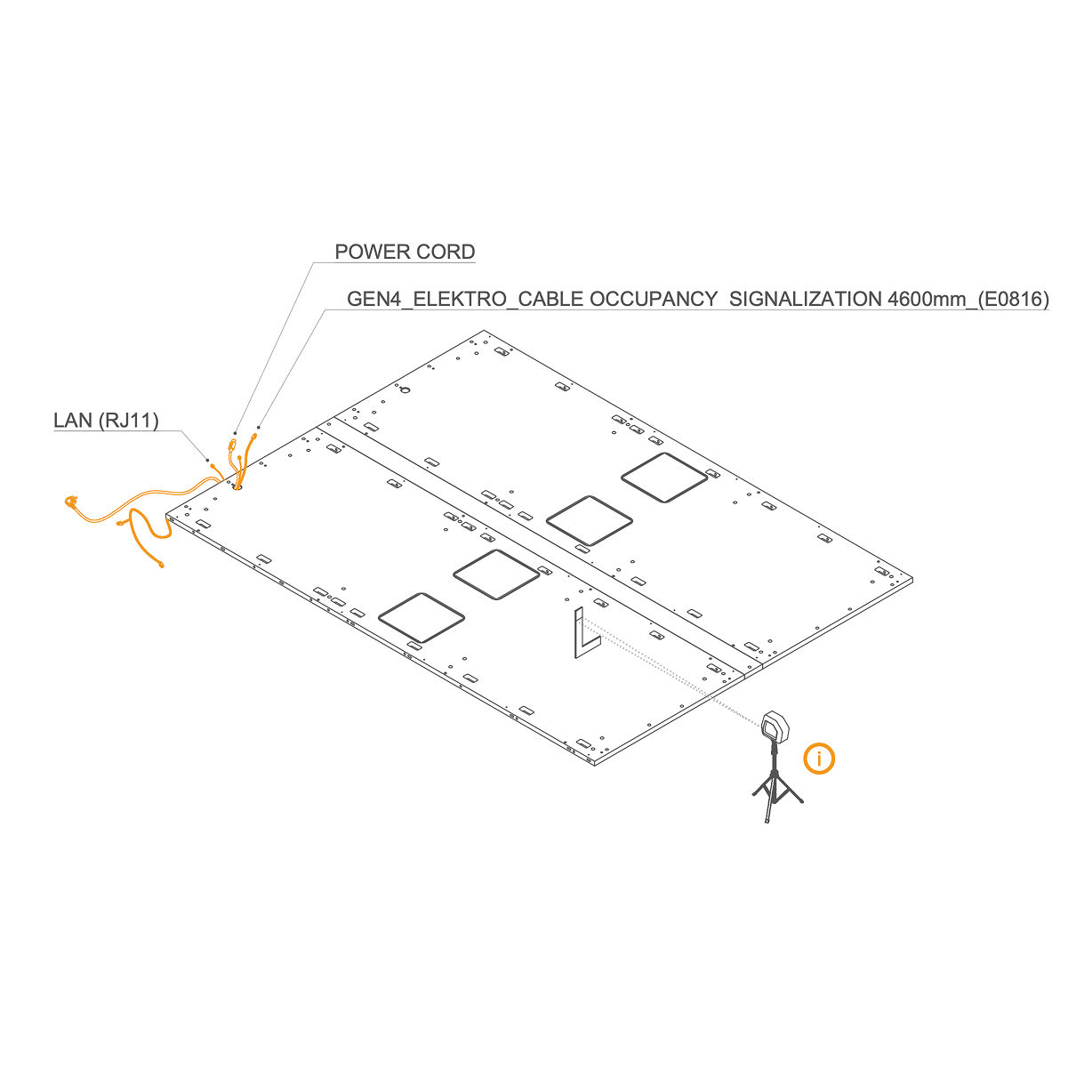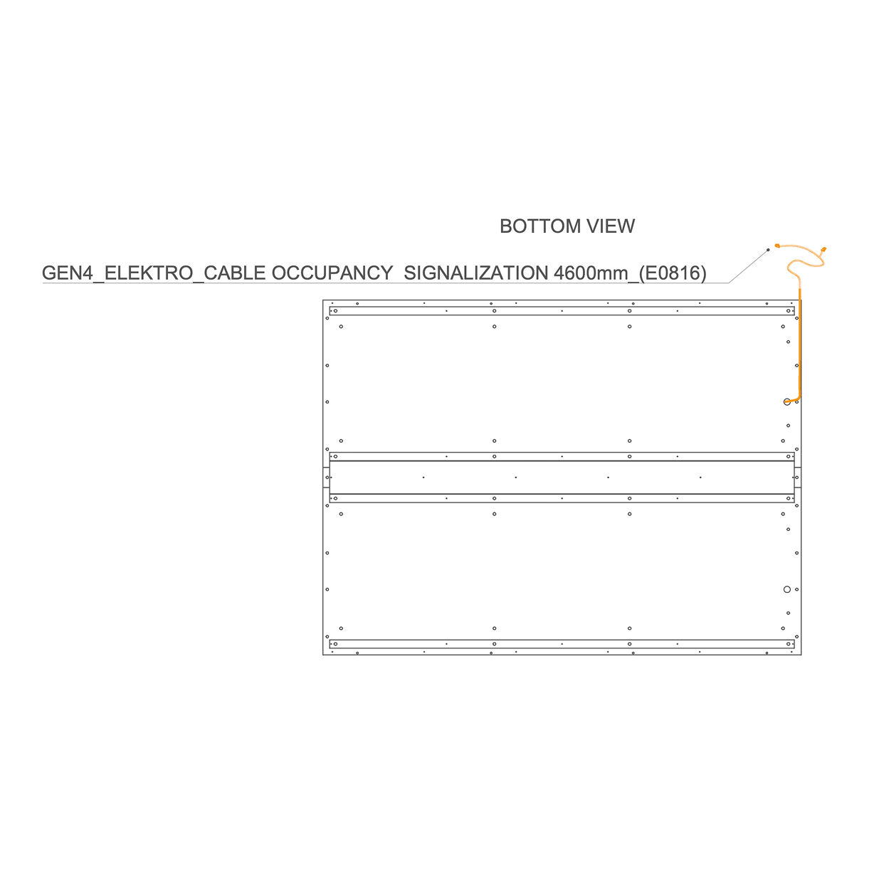 Lay the GEN4_ELEKTRO_CABLE OCCUPANCY SIGNALIZATION 4600 mm (E0816), LAN cable (RJ45), and power cord through the hole in the floor panel. Follow the marked path shown in the bottom view, ensuring the cables are not pinched.