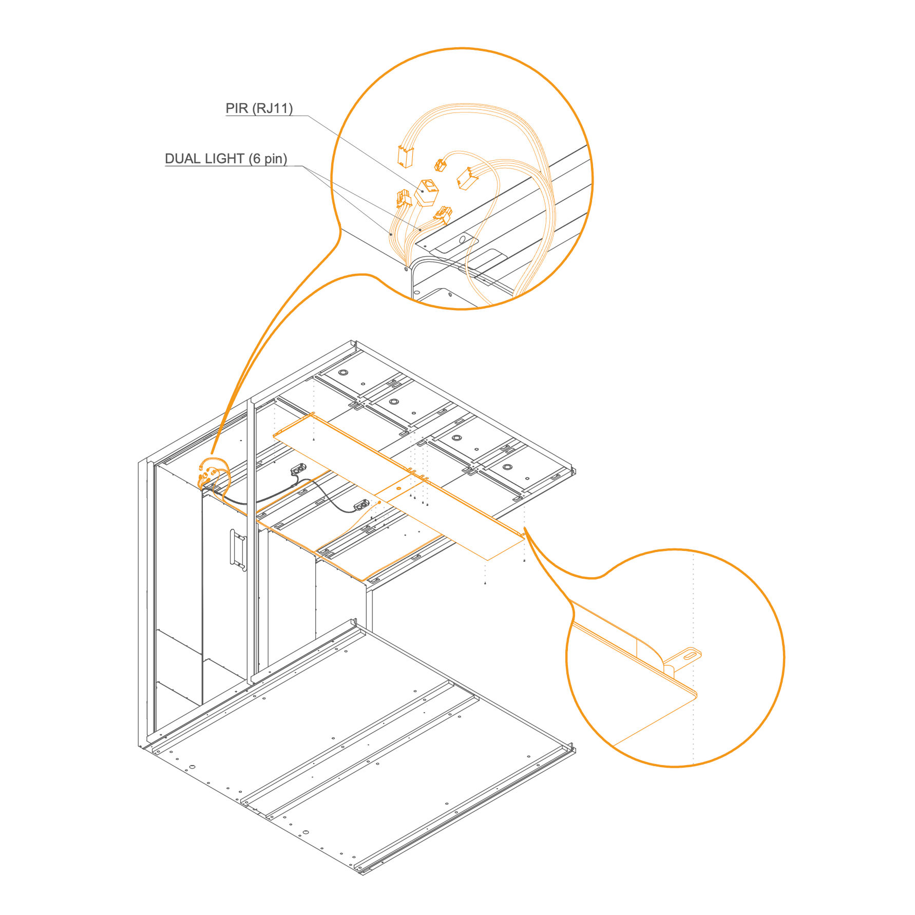 - Connect the PIR sensor cable (RJ11) and the dual light cable (6 pin).