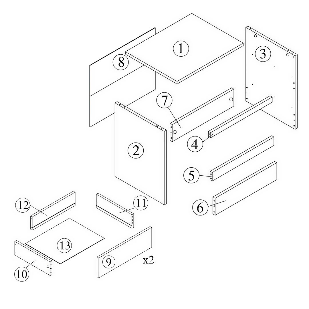 Insert wooden dowels (B) into all pre-drilled holes on the following panels: