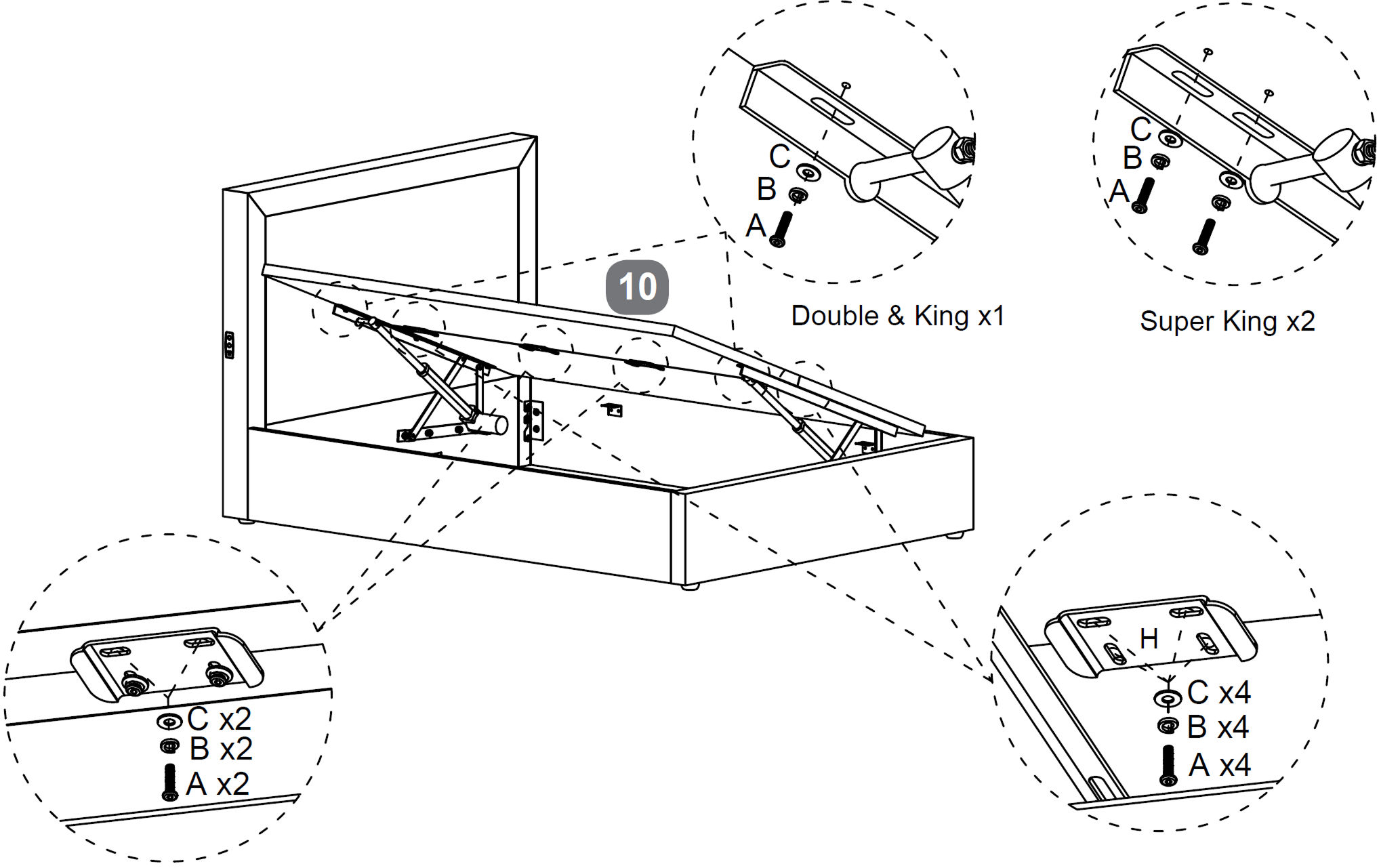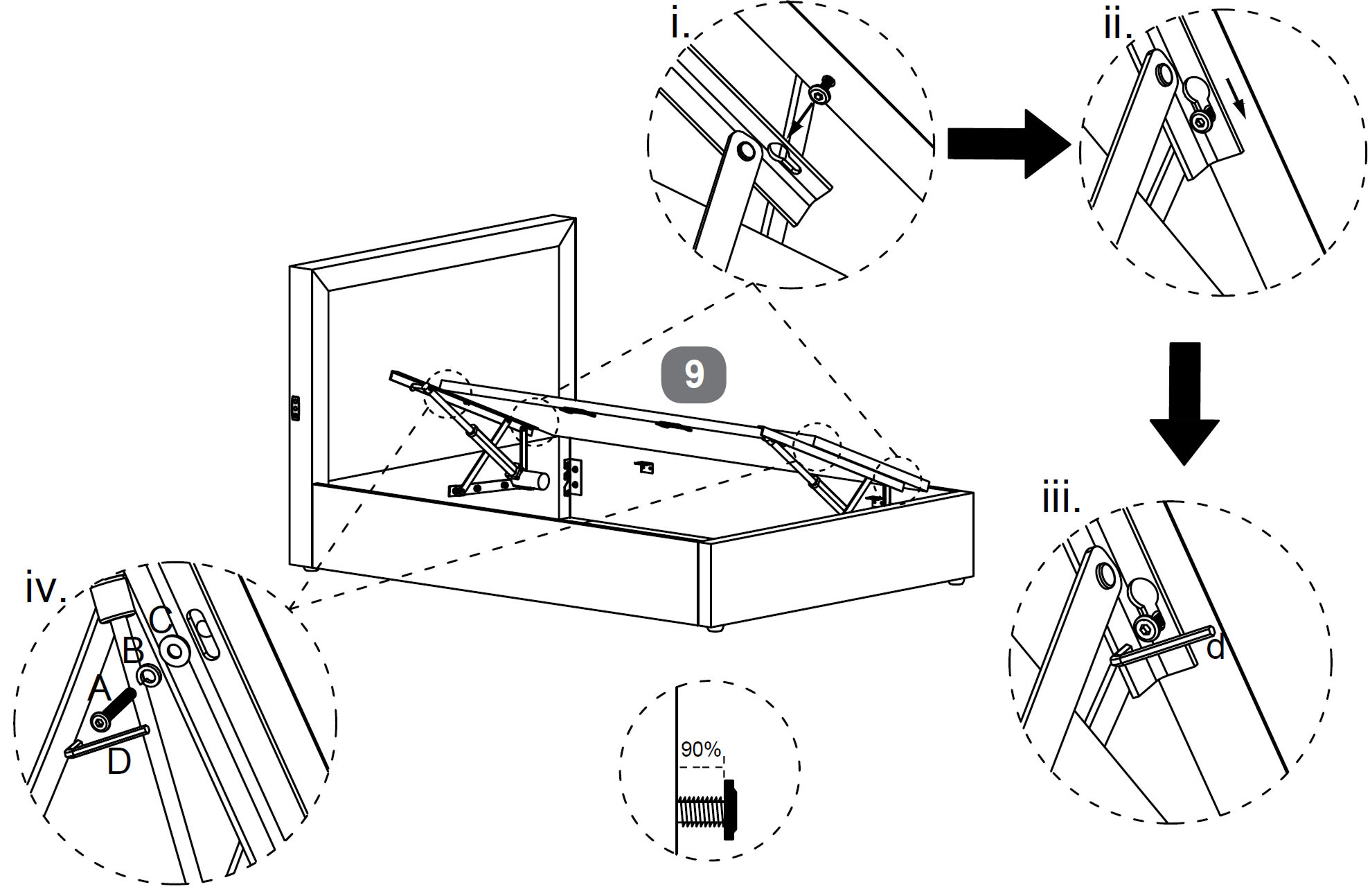 Tighten all bolts securely using the Allen Key (D), making sure the mattress base board is firmly fixed and moves smoothly with the lift mechanism.