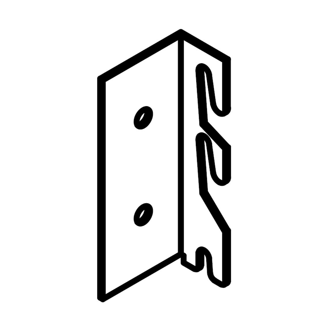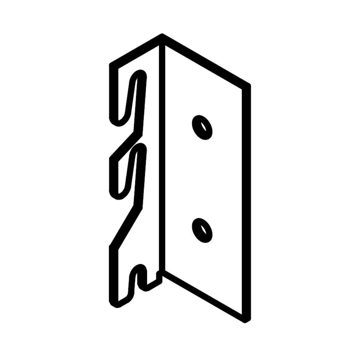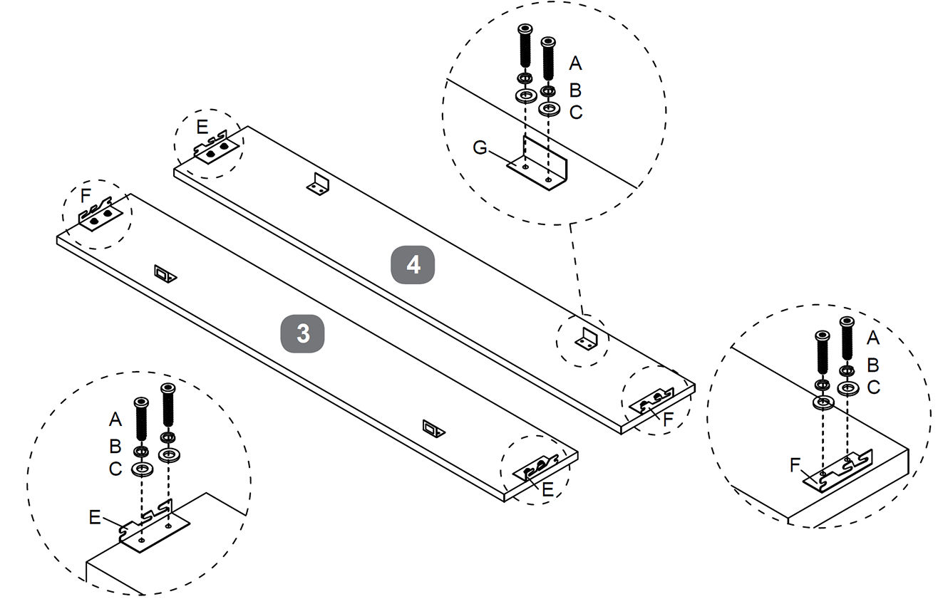 - Position the Corner Hook Bracket - Flat (F) at one end of each side rail and the Corner Hook Bracket (E) at the opposite end, aligning the holes as shown in the diagram.