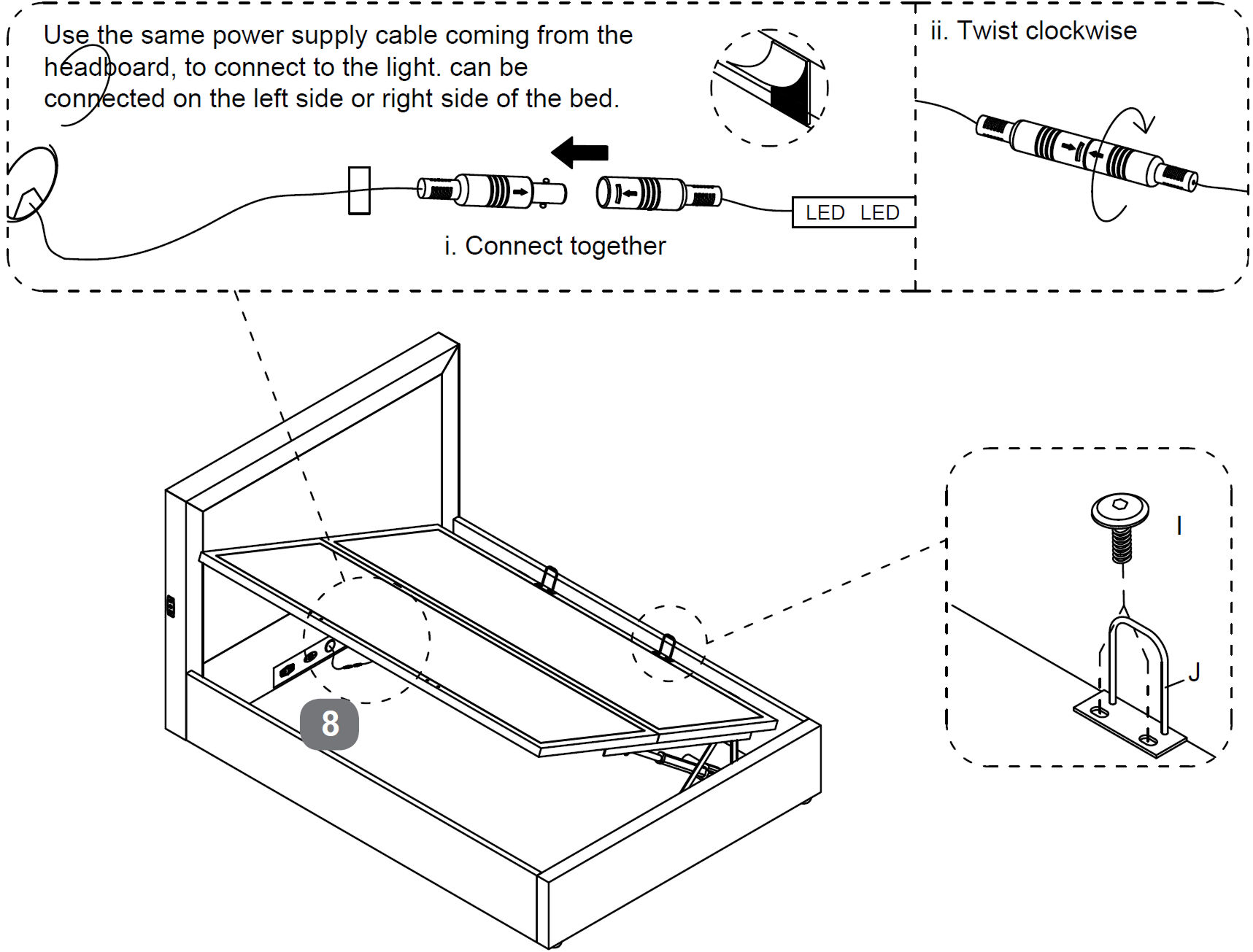 11. Connect the LED Power Cable and Fit Mattress Stoppers
