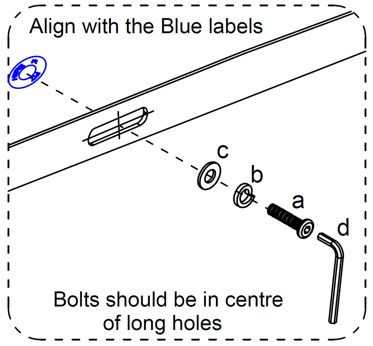 - Tighten the bolts using the Allen Key (D), leaving a small amount of adjustment until the frame is fully assembled.