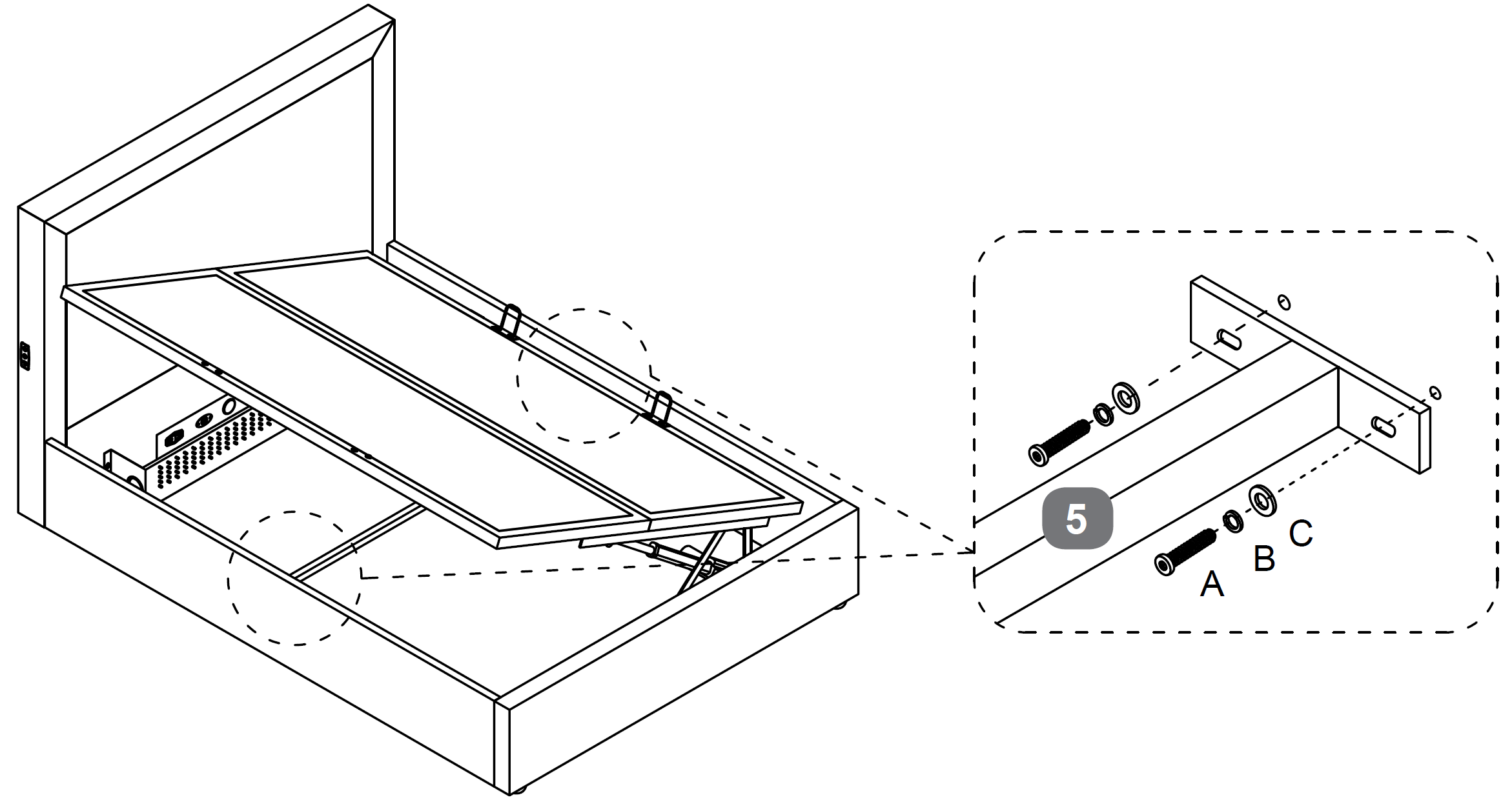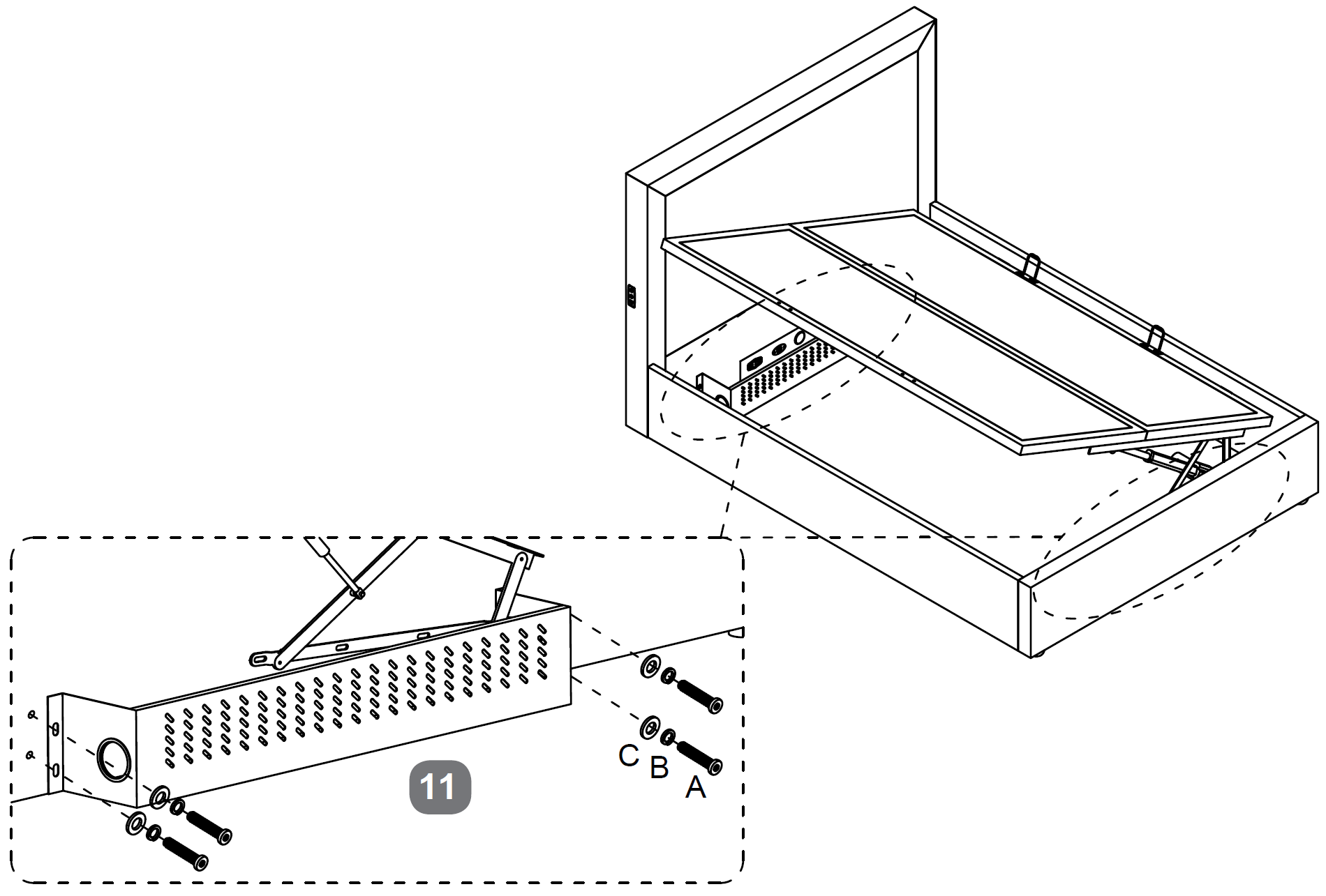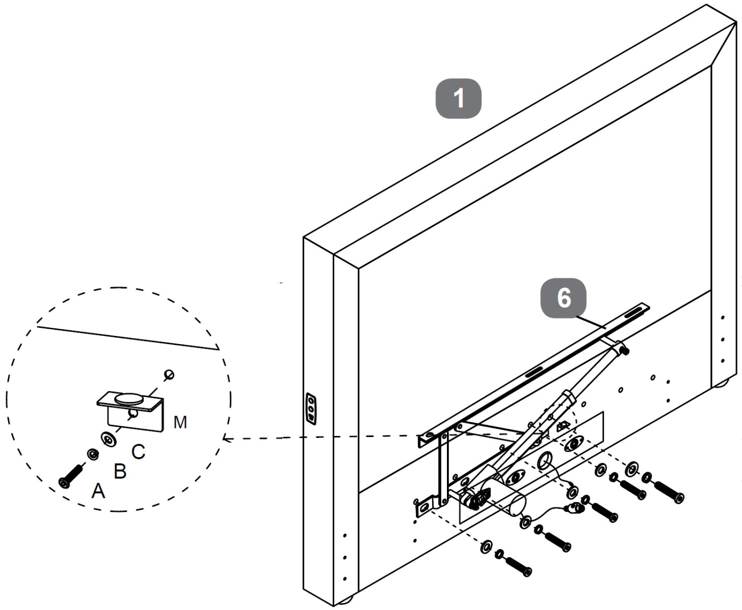 - Insert Bolt (A) with Spring Washer (B) and Flat Washer (C) through the gas lift mechanisms and into the frame.