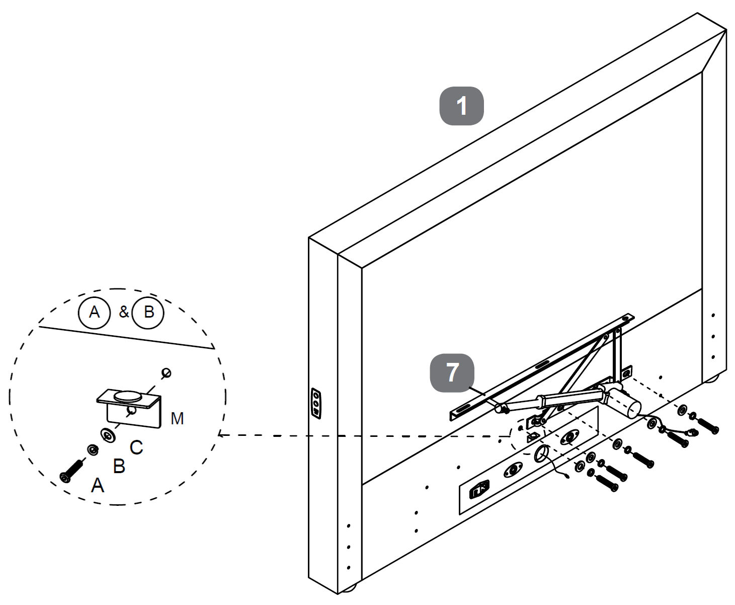 - Insert Bolt (A) with Spring Washer (B) and Flat Washer (C) into all fixing points and tighten loosely at first.